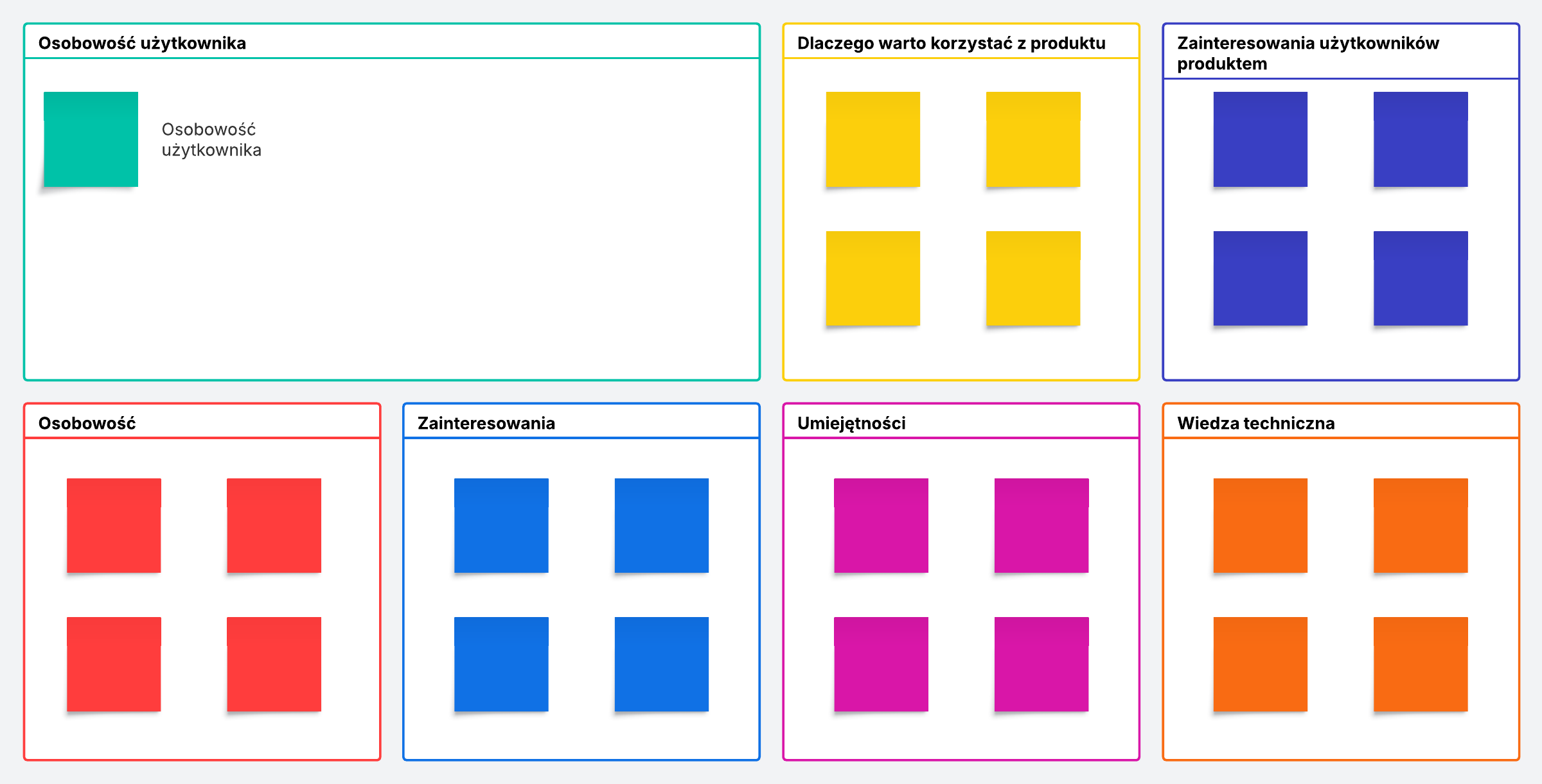 Dowiedz się, dlaczego odbiorcy, do których kierujesz swoje działania, są tak aktywni, opracowując model osobowości użytkowników. Dodaj do tego szablonu istotne szczegóły i informacje o użytkownikach, a następnie podziel się nim z całym zespołem, aby wszyscy byli na bieżąco.