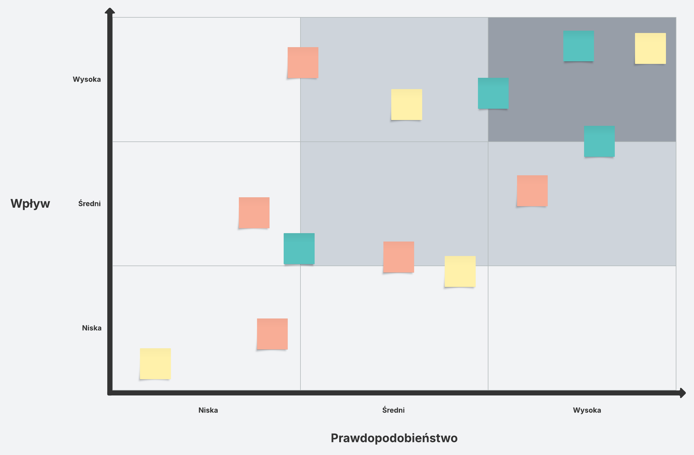 Ustalenie priorytetów działań lub pomysłów w oparciu o wpływ i prawdopodobieństwo. Każda oś jest podzielona na poziom niski, średni i wysoki, co wspomaga zapewnianie dodatkowej struktury innej niż tradycyjne układy 2x2.
