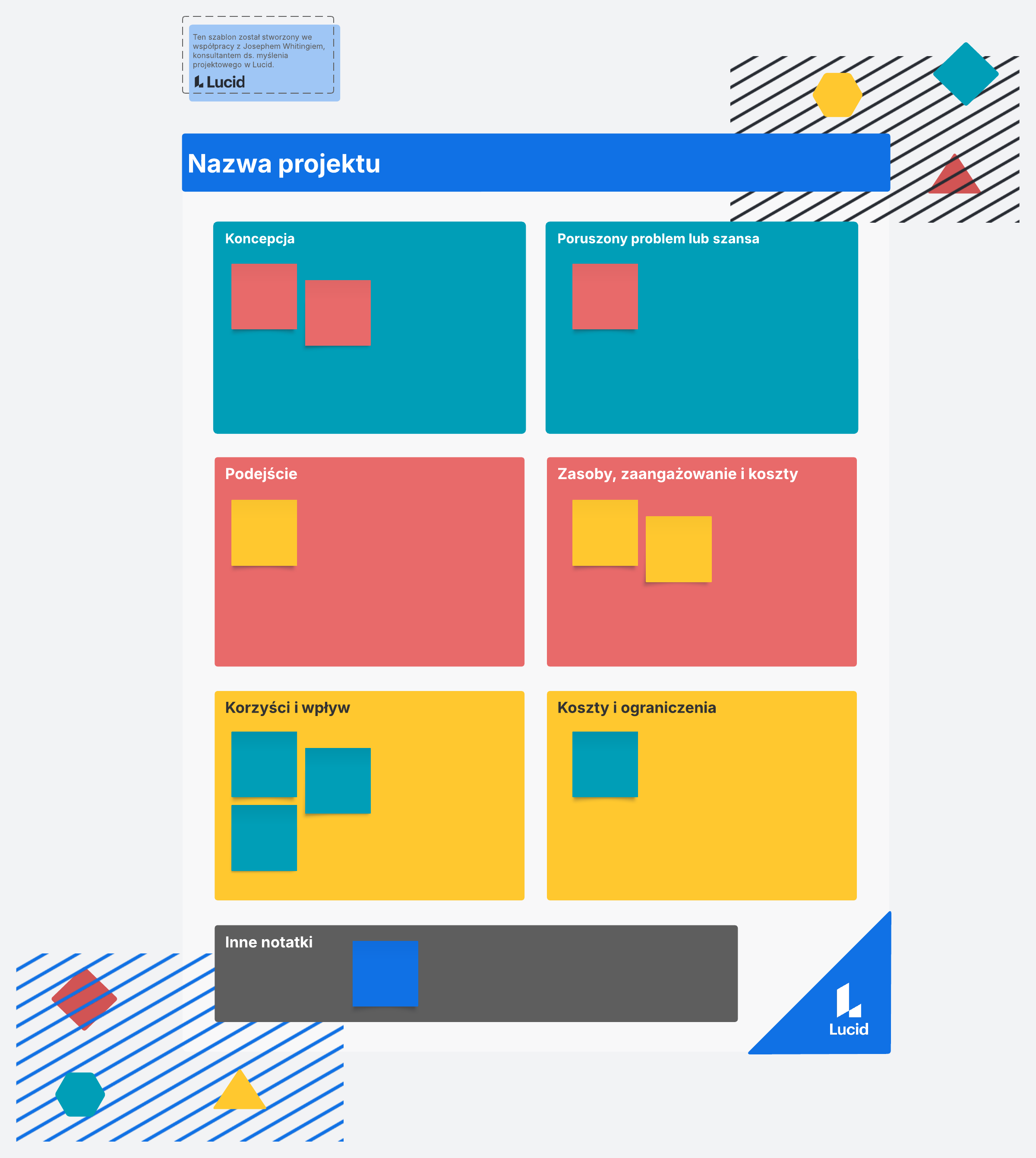 Jeśli Twoja koncepcja zostanie zaakceptowana, szablon wciąż będzie przydatny – stanie się zasobem umożliwiającym szybkie wyjaśnienie celów i przeznaczenia projektu zespołom zaangażowanym w jego realizację.