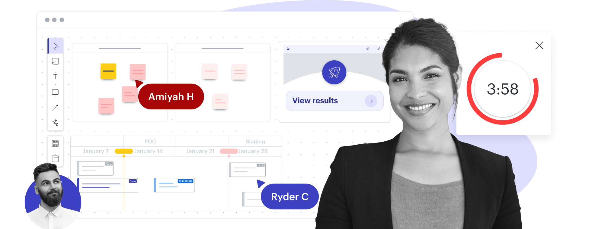 Mantenha sua sessão de brainstorming e sua equipe no caminho certo com recursos como assumir a liderança e temporizador.