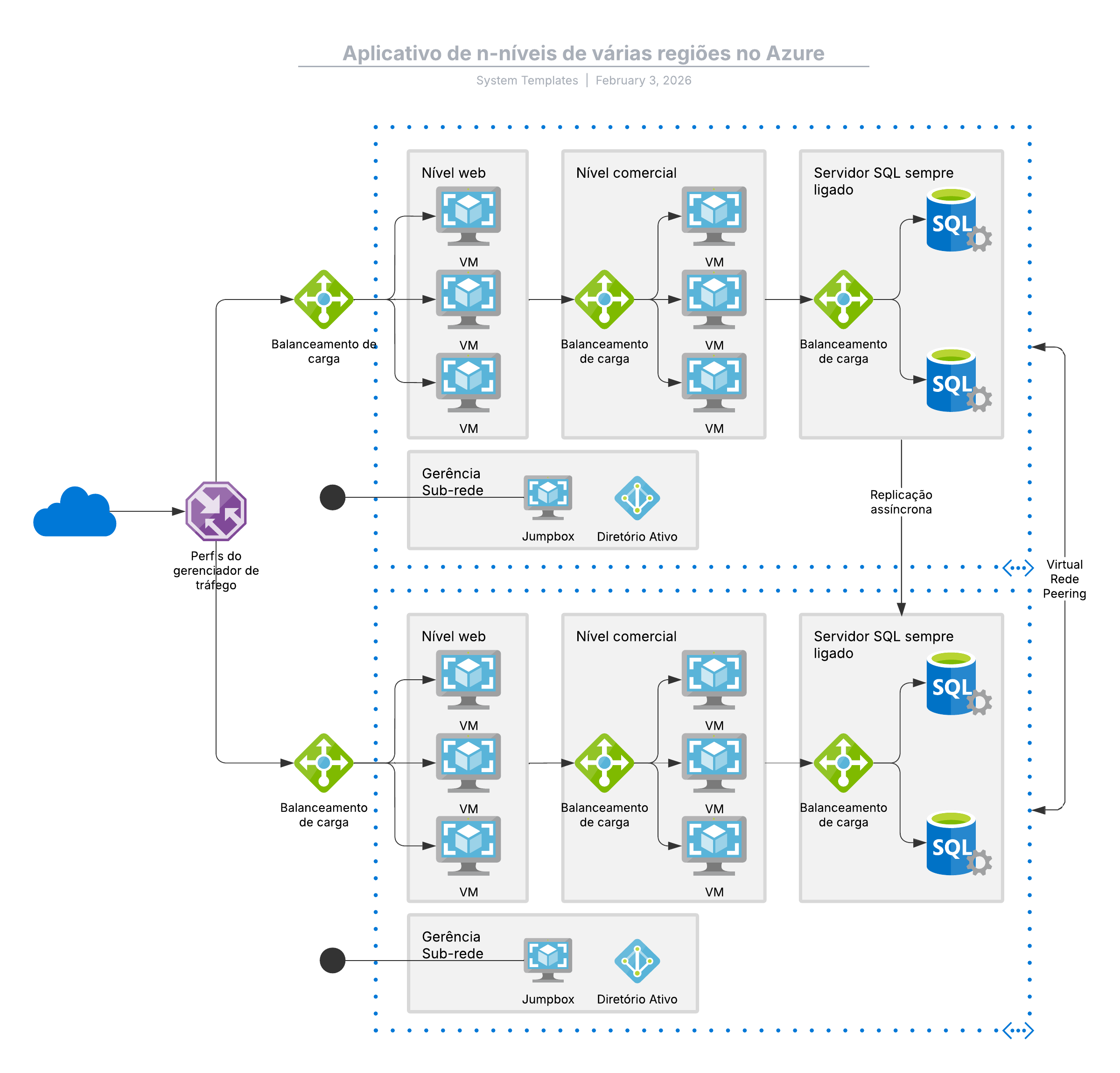 Abra este modelo para exibir uma arquitetura de referência de aplicativo de n-níveis de várias regiões do Azure, personalizável de acordo com seu caso de uso.