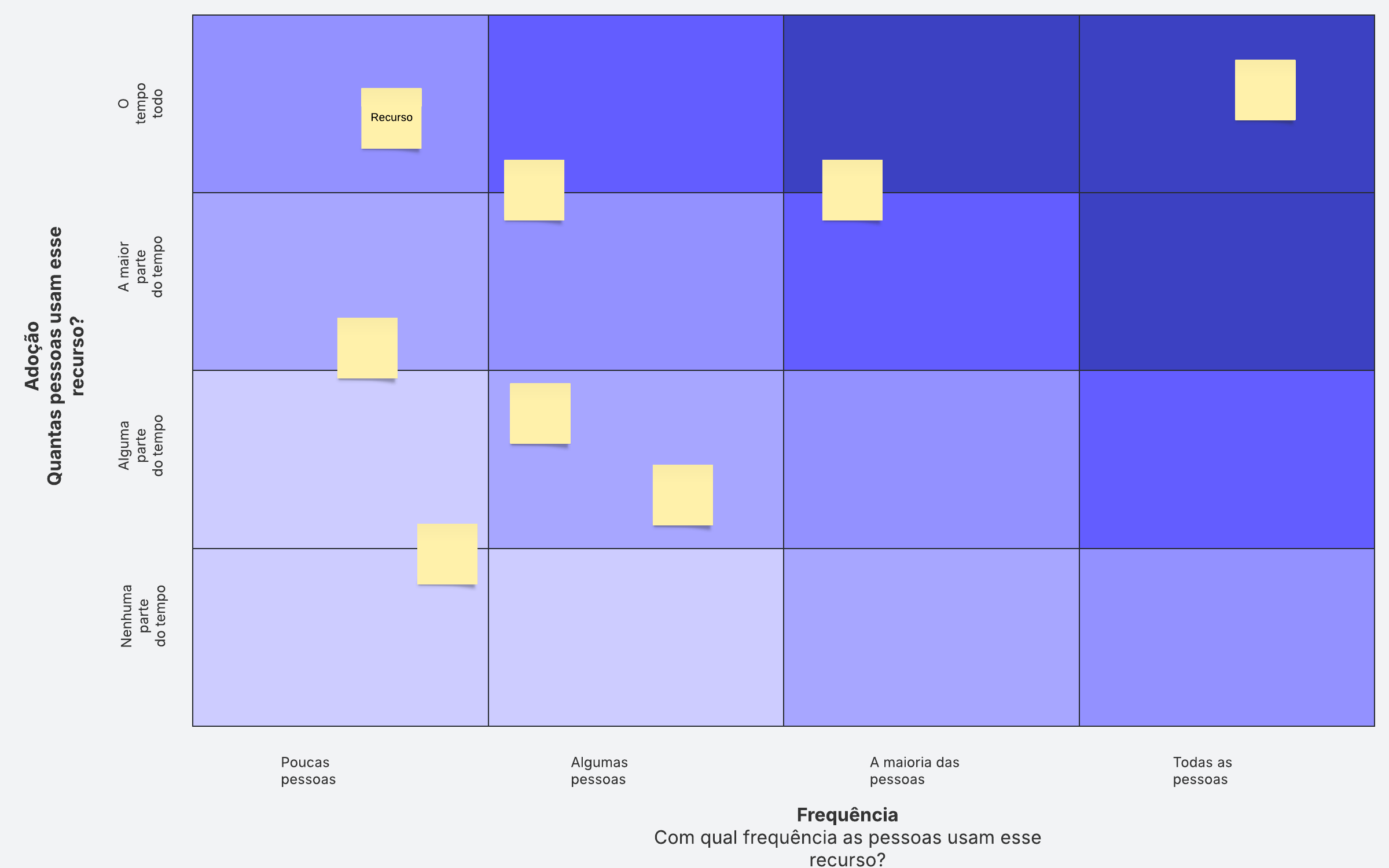 Faça uma auditoria de recursos para poder investir nos recursos mais importantes. Adicione recursos à matriz de acordo com sua frequência de uso e adoção.