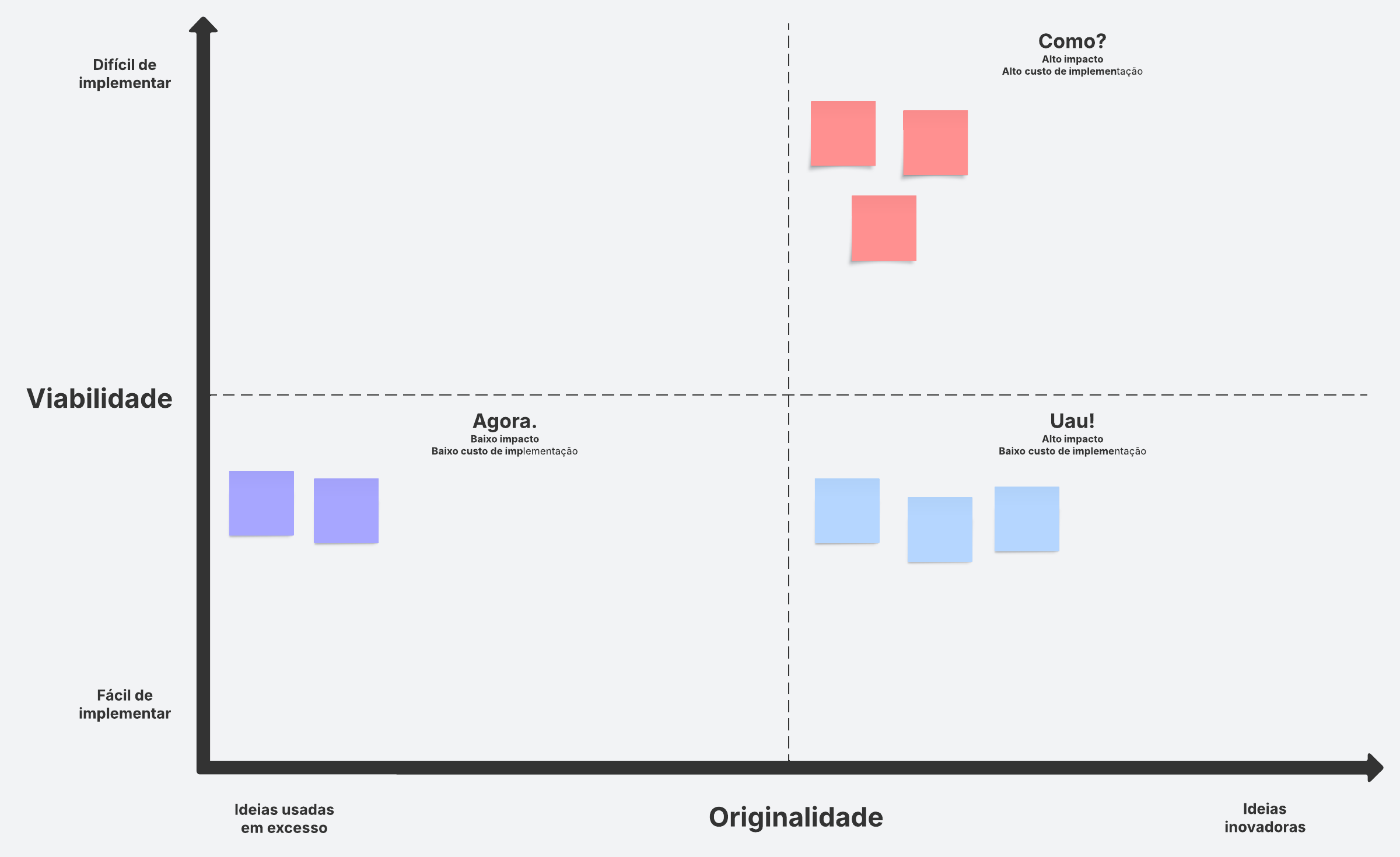 Use esta matriz de Como, Agora, Uau para avaliar ideias de acordo com a viabilidade e originalidade. Insira suas ideias na matriz para identificar quais são inovadoras e podem ser implementadas rapidamente.