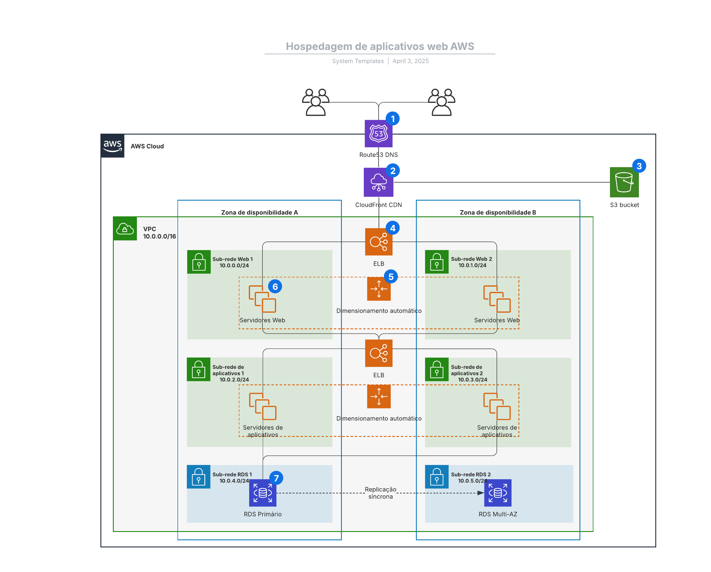Abra este modelo para ver um sistema de hospedagem web AWS altamente disponível e flexível.