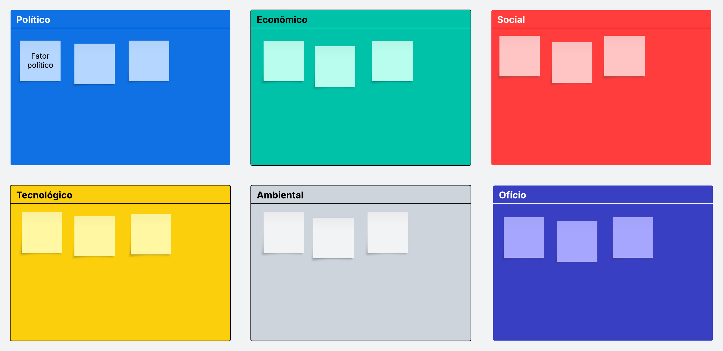 O modelo PESTEL Lucidspark é pré-criado com seis contêineres nos quais todas as seis categorias de fatores externos são listadas.