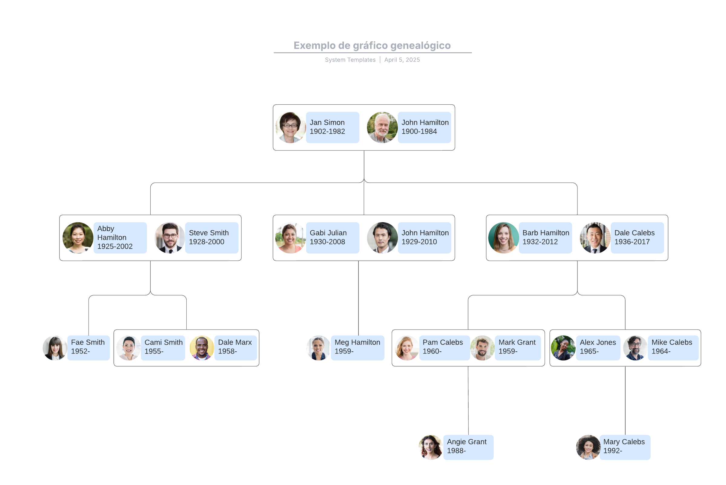 Abra este modelo para exibir um exemplo detalhado de uma árvore genealógica, personalizável de acordo com seu caso de uso.