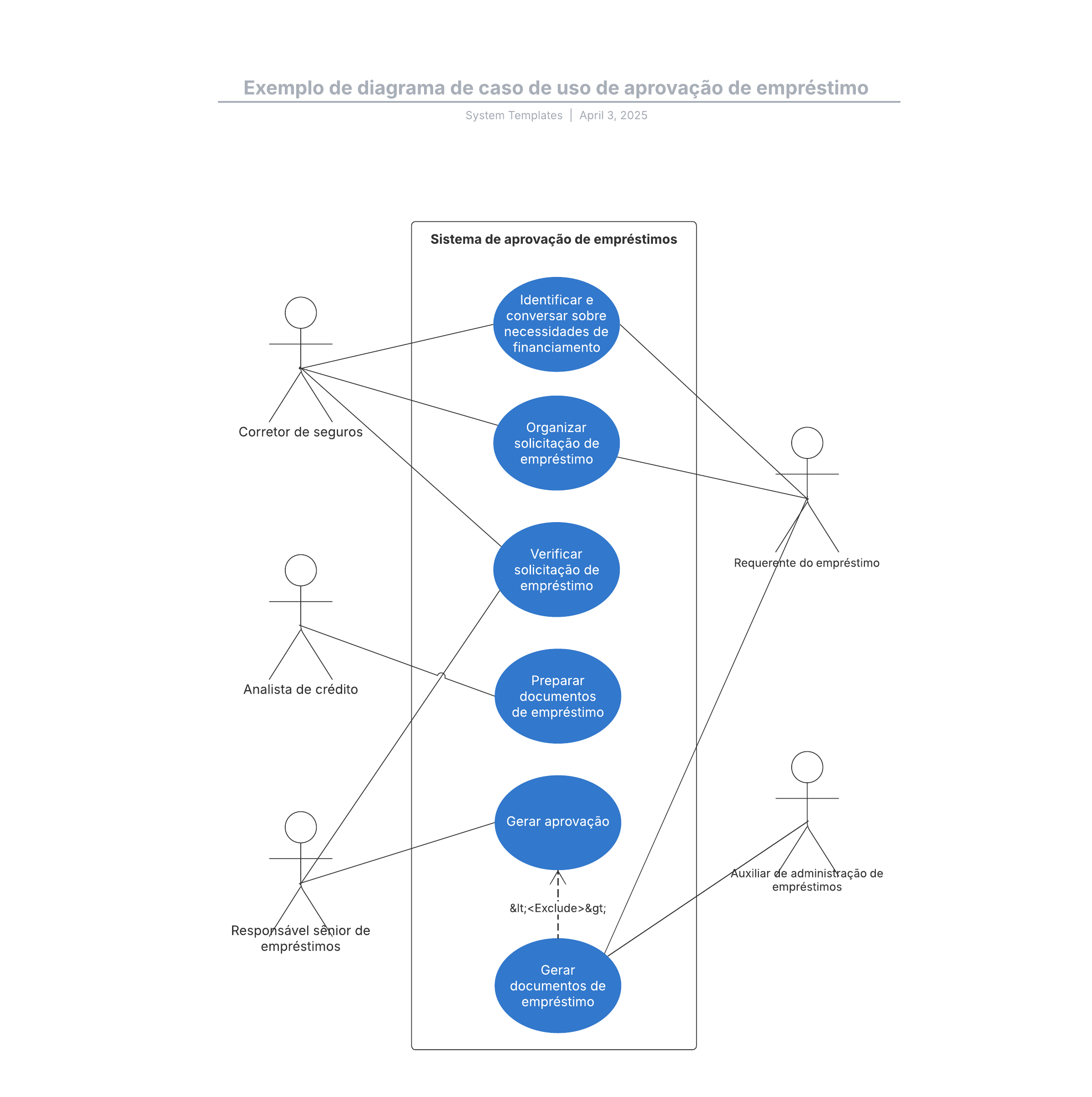 Abra este modelo para ver um exemplo detalhado de um diagrama de caso de uso de aprovação de empréstimo, personalizável de acordo com seu caso de uso.