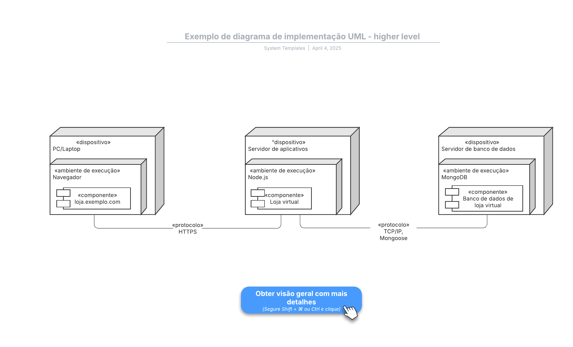 Abra esse modelo para ver o exemplo detalhado de um diagrama de implementação UML, personalizável de acordo com seu caso de uso.