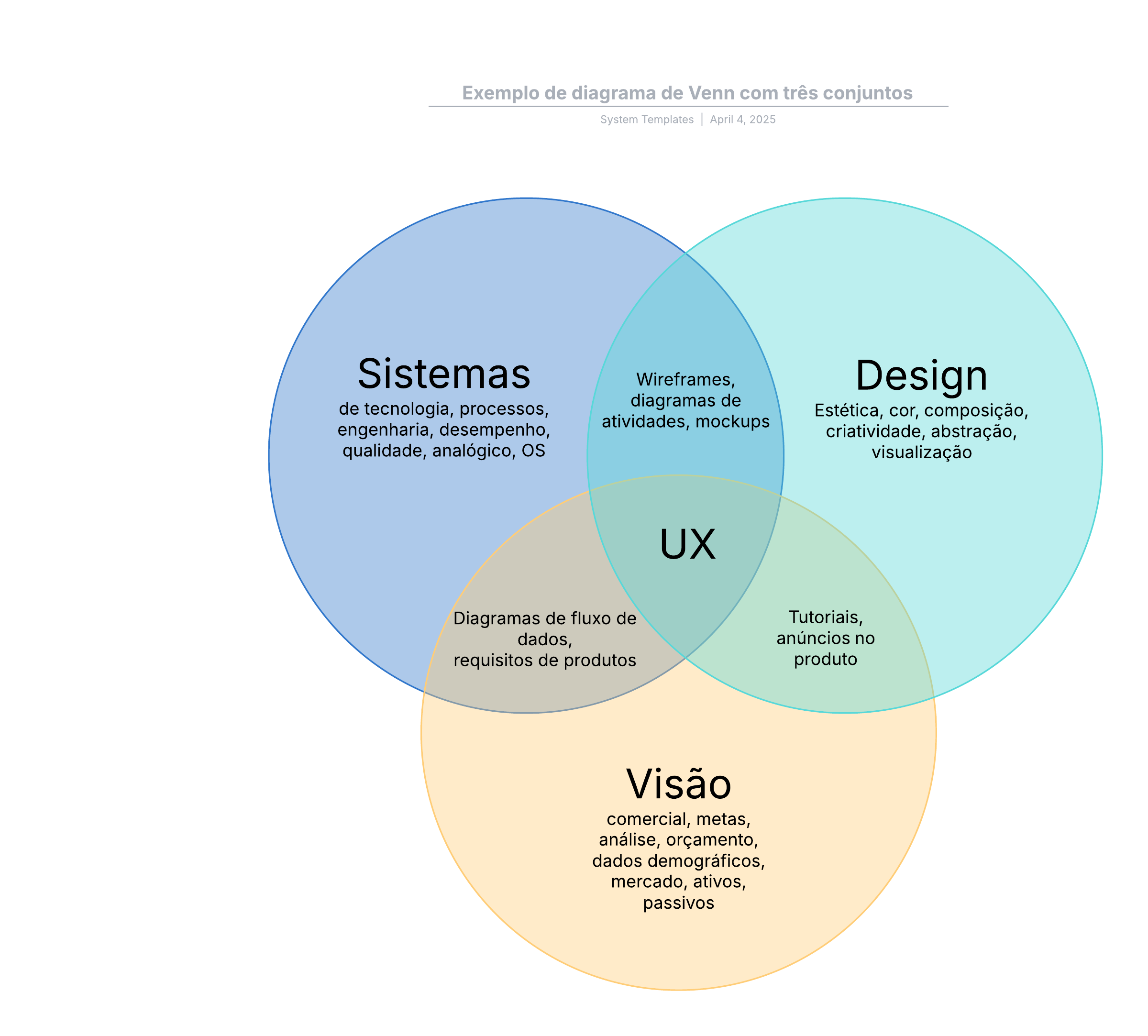 Abra este modelo para exibir um exemplo detalhado de um diagrama de Venn com três conjuntos, personalizável de acordo com seu caso de uso.