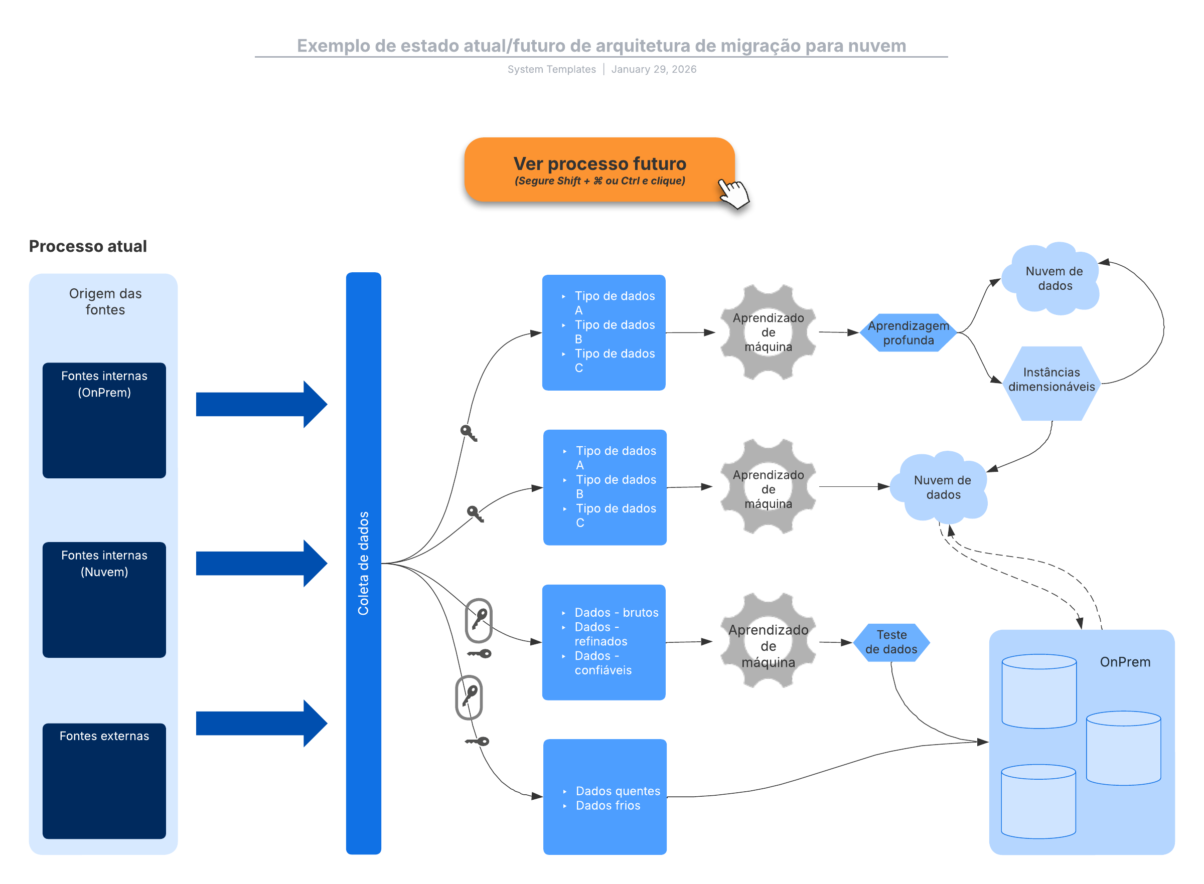 Abra este modelo e adicione conteúdo para personalizar o diagrama de estado atual/futuro de arquitetura de migração para a nuvem de acordo com seu caso de uso.