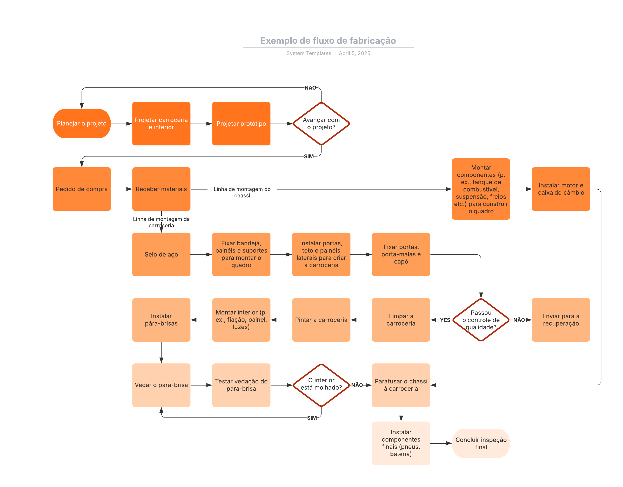 Abra este modelo para exibir um exemplo detalhado de um diagrama de fluxo de fabricação, personalizável de acordo com seu caso de uso.