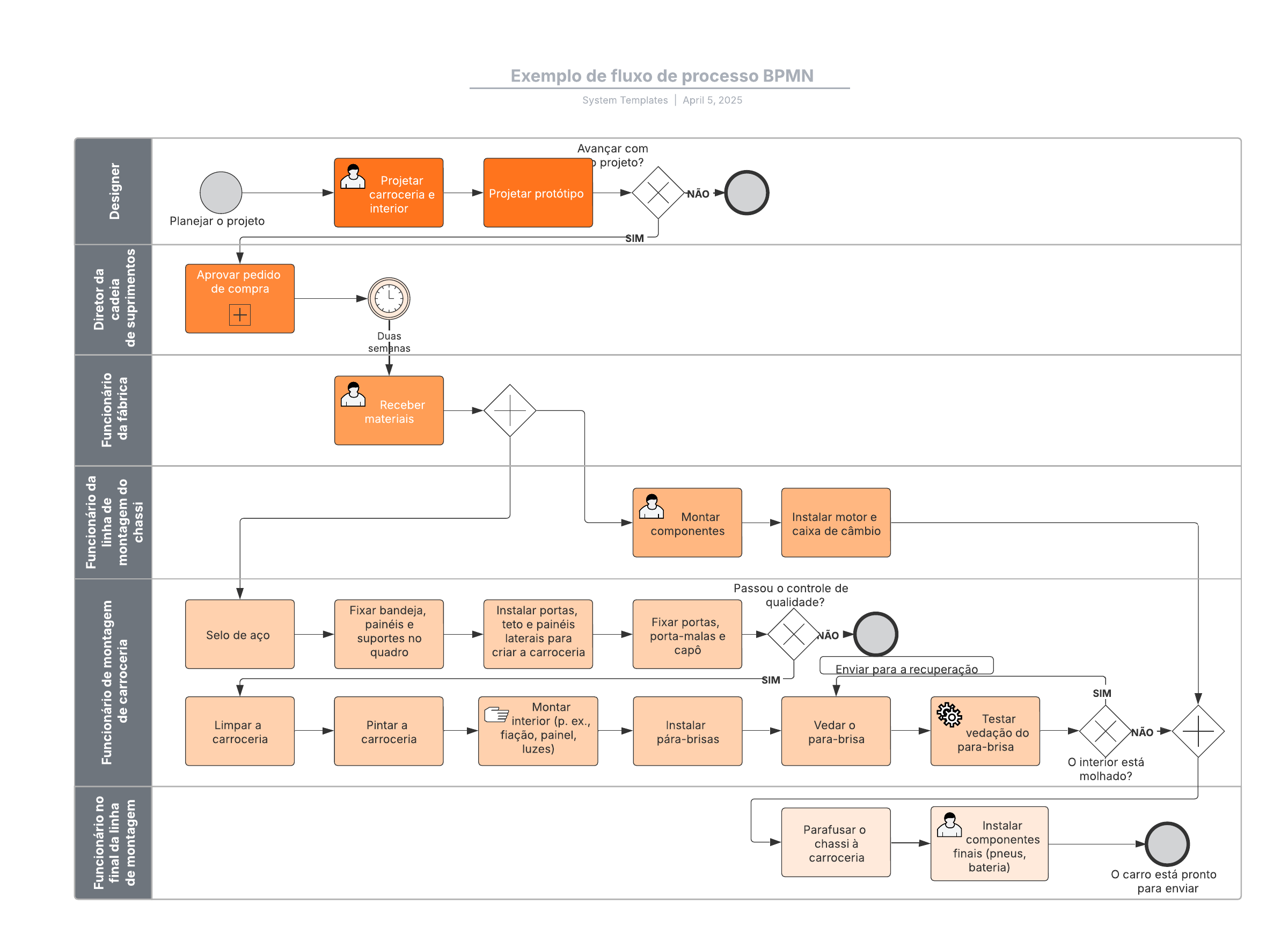Abra este modelo para exibir um exemplo detalhado de um diagrama de fluxo de processos BPMN, personalizável de acordo com seu caso de uso.