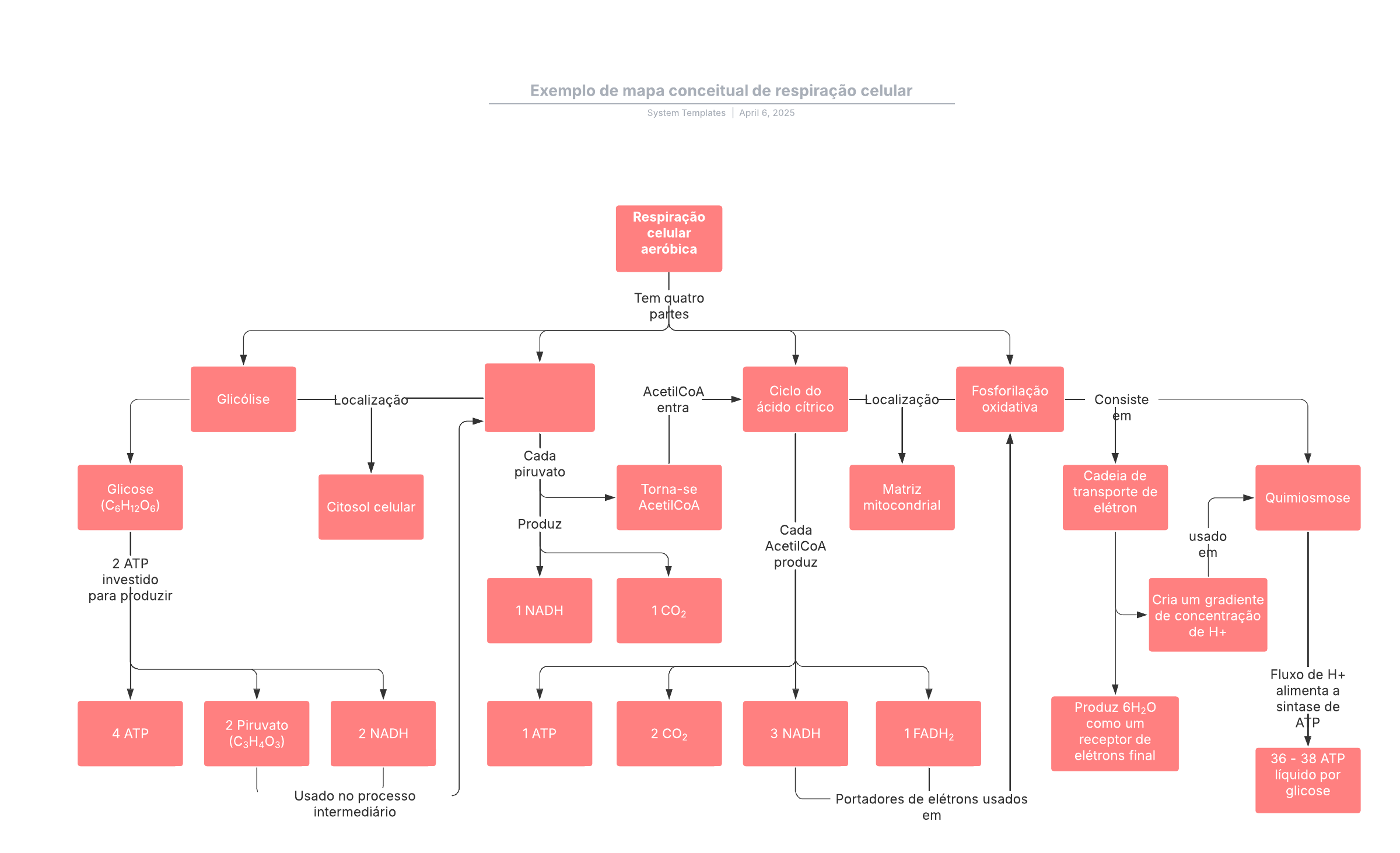Abra este modelo para ver um exemplo detalhado de um mapa conceitual de respiração celular, personalizável de acordo com seu caso de uso.