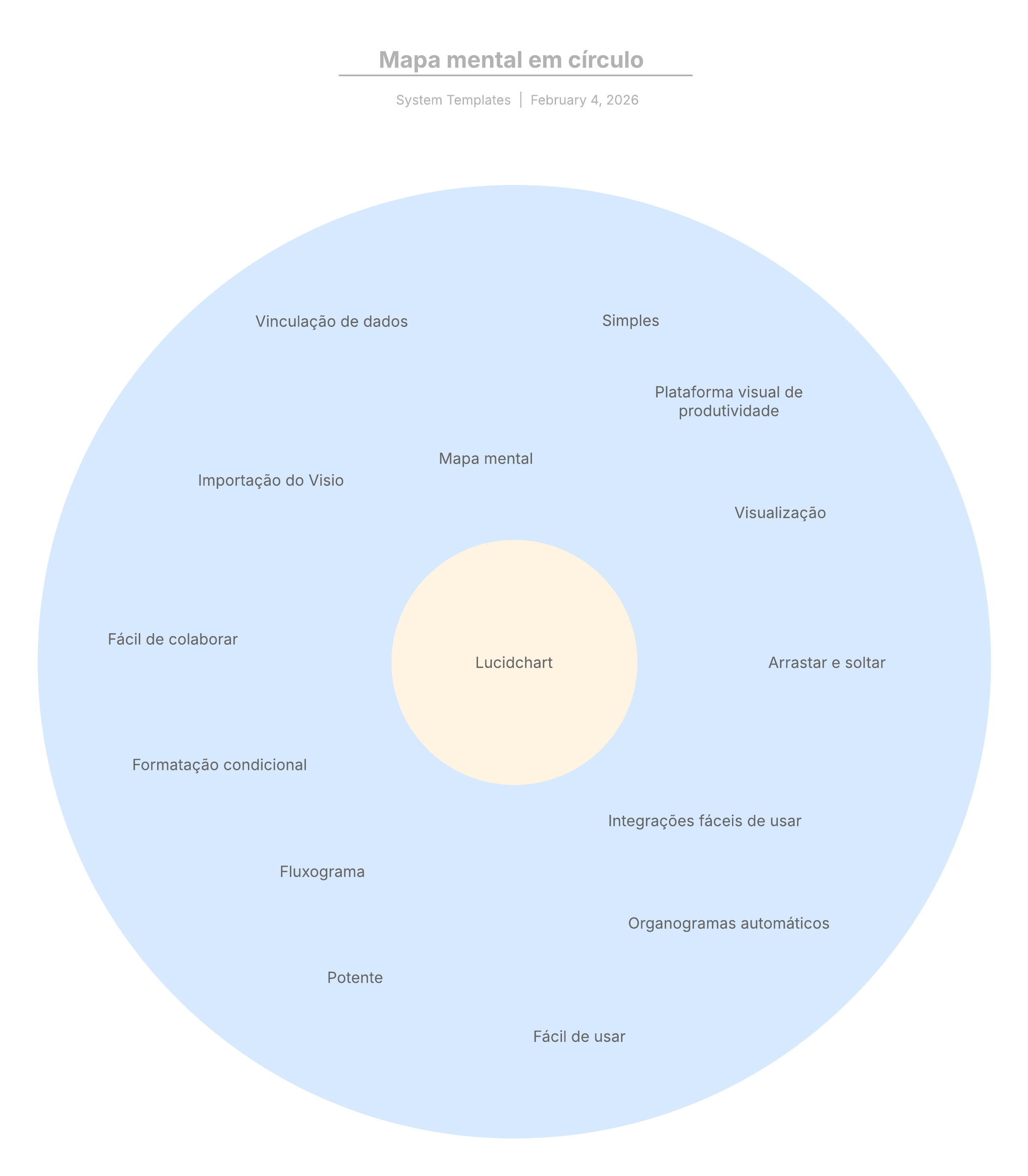 Os mapas mentais circulares ajudam a descrever uma ideia ou conceito principal (no centro) usando exemplos, conceitos e ideias secundários (no círculo externo).