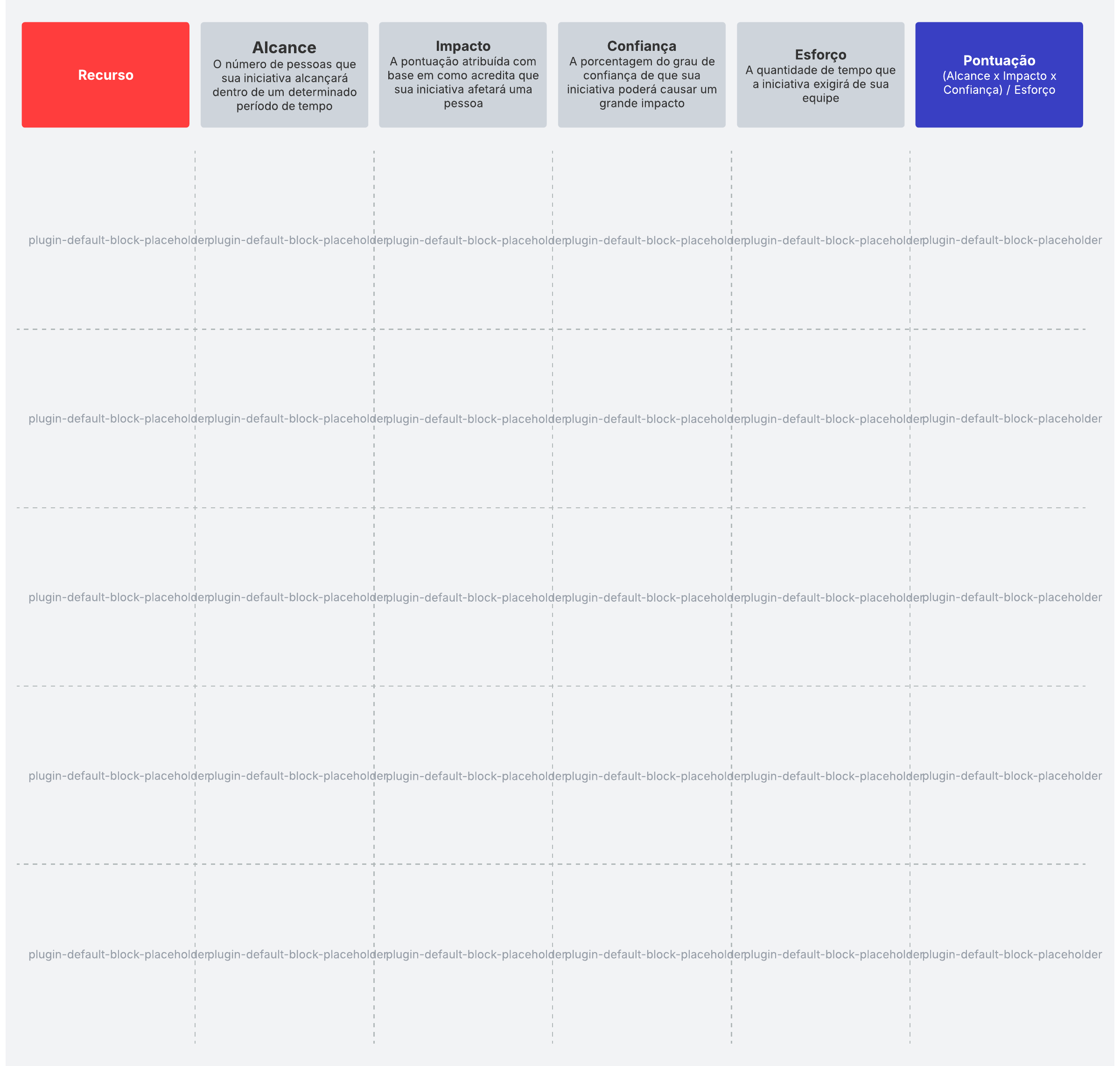 Priorize quais produtos ou recursos serão adicionados ao seu roteiro, atribuindo-lhes uma pontuação de acordo com quatro fatores: Alcance, Impacto, Confiança e Esforço.