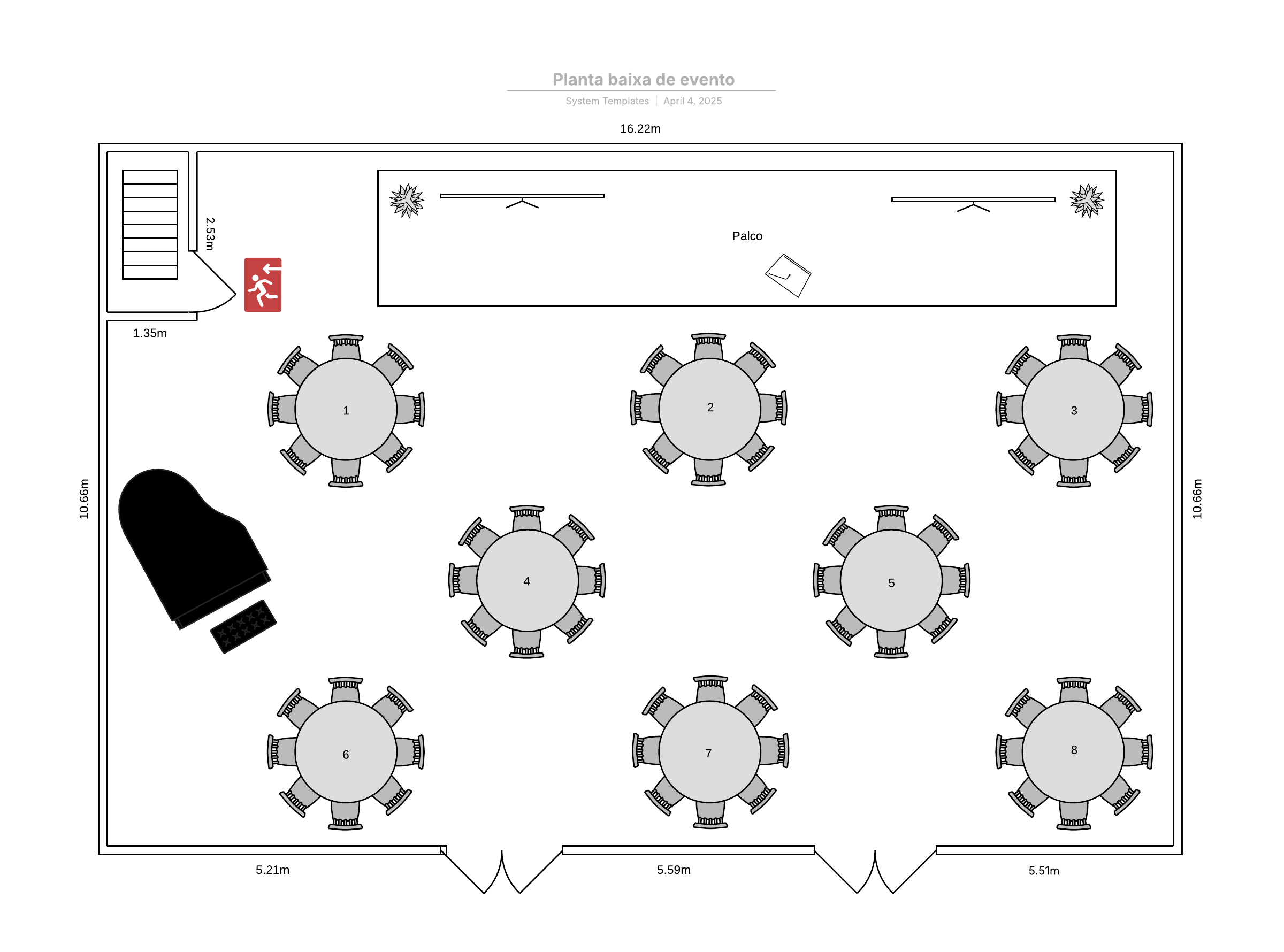 Use esta planta baixa para planejar seus eventos. Assim você poderá ver se o espaço será adequado para o que será usado e poderá antecipar qualquer mudança necessária ao projeto.