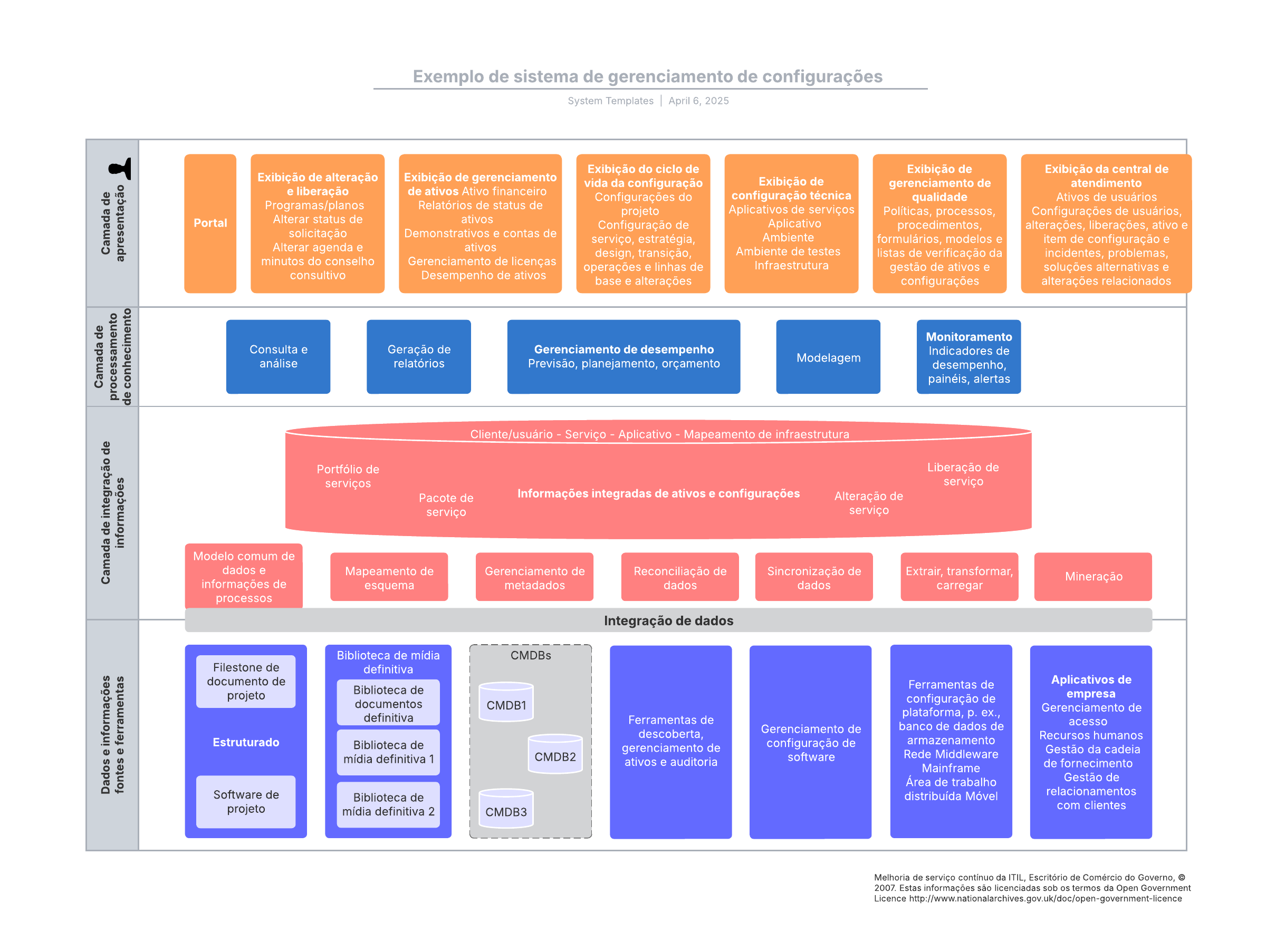 Abra este modelo para ver um exemplo detalhado de um diagrama de sistema de gerenciamento de configurações, personalizável de acordo com seu caso de uso.