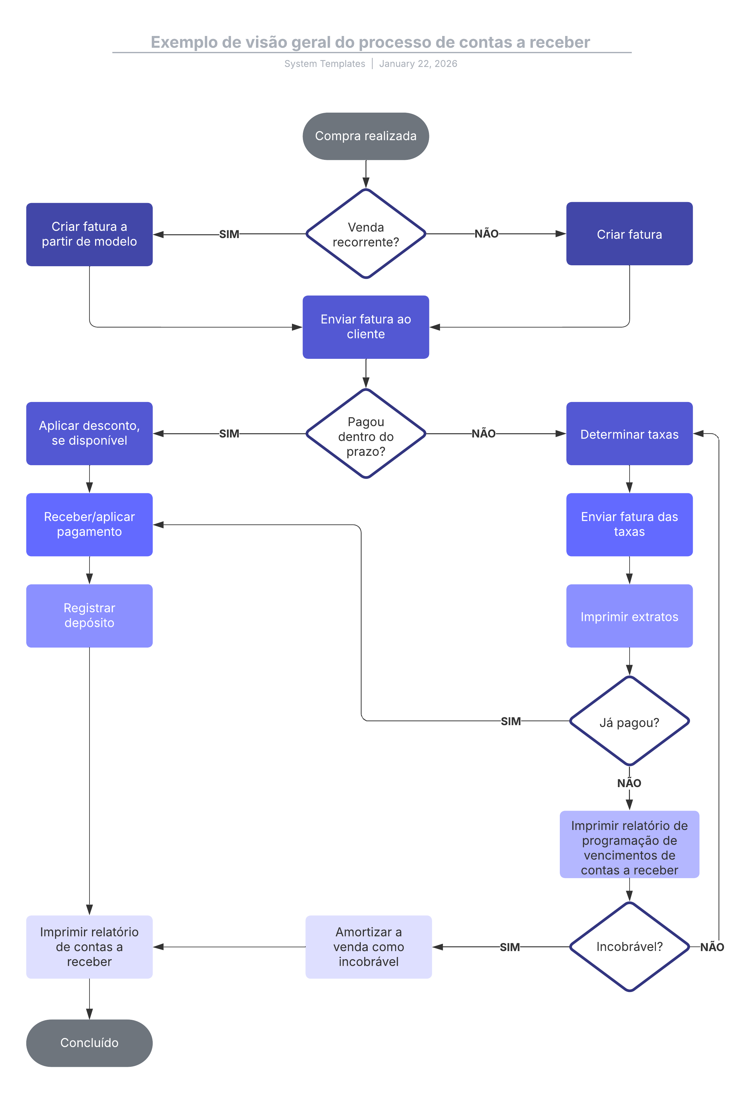 Abra este modelo para exibir um exemplo detalhado de um fluxograma do processo de contas a receber, personalizável de acordo com seu caso de uso.