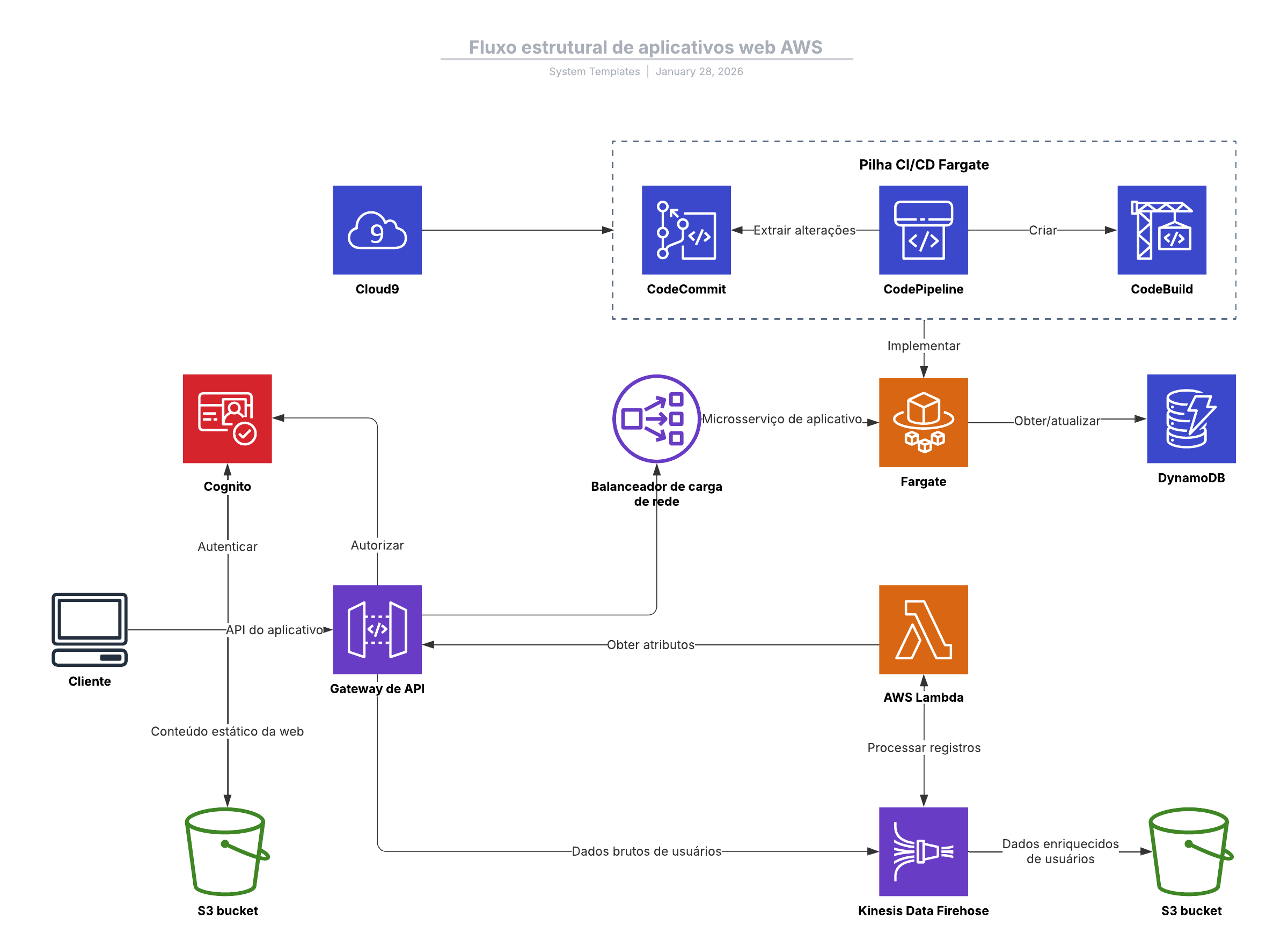 Abra este modelo para visualizar um exemplo de um fluxo estrutural de aplicativos web AWS, personalizável de acordo com seu caso de uso.