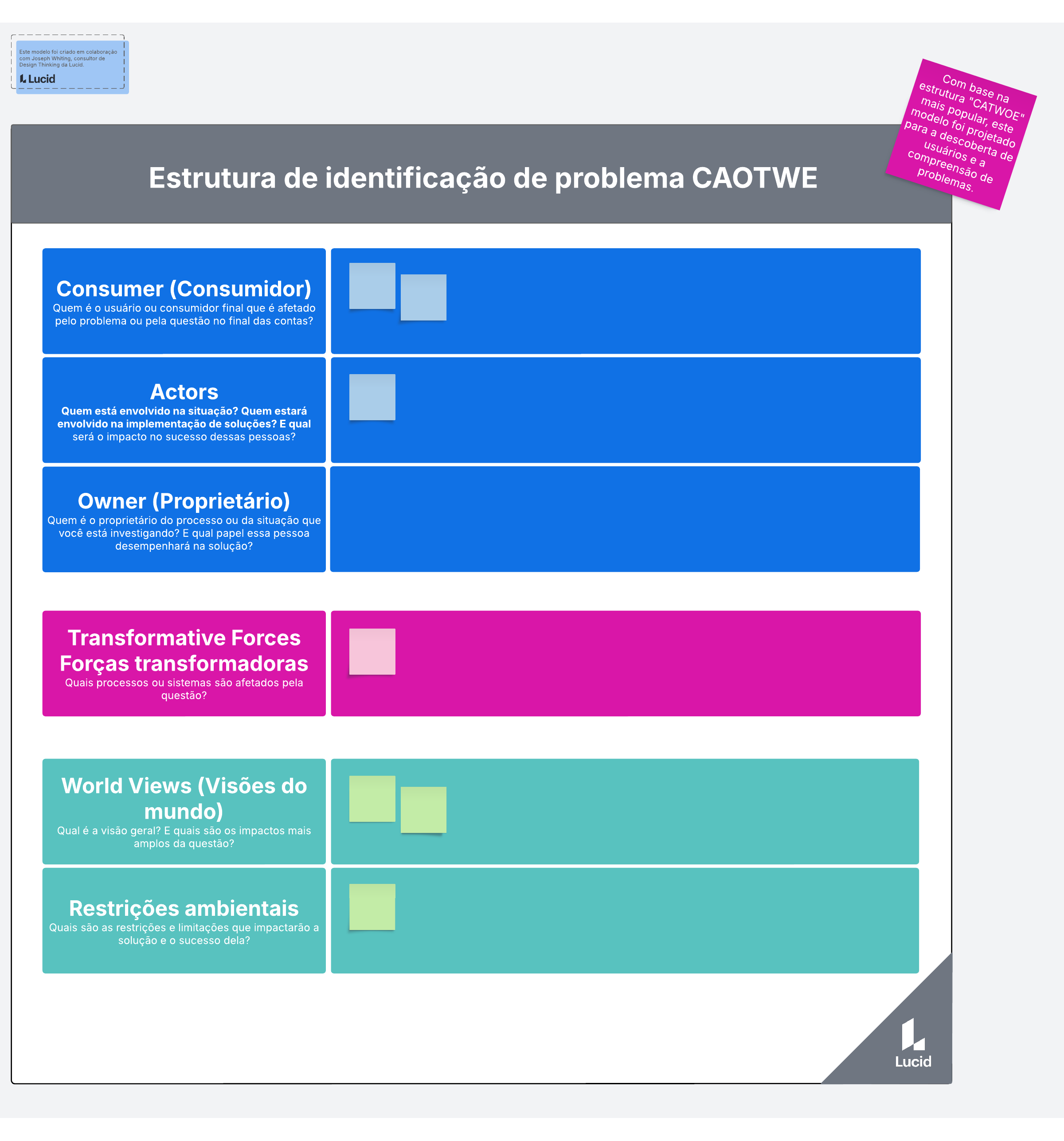Com base na estrutura CATWOE, esta ferramenta pode ajudar você a identificar fatores-chave no âmbito do problema e garantir que você esteja adotando uma abordagem holística para compreender o desafio em questão.
