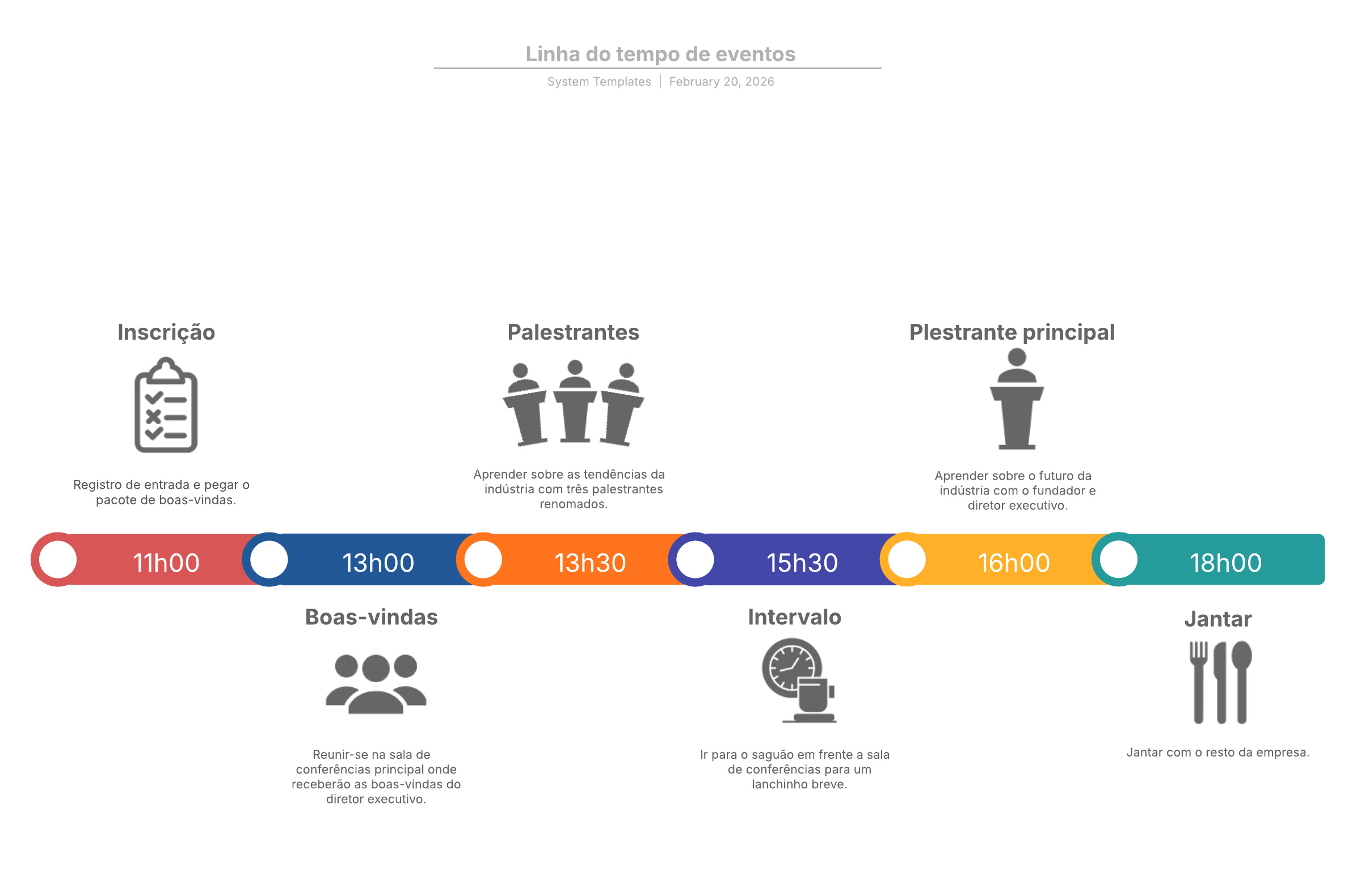 Abra este modelo para ver um exemplo detalhado de linha do tempo de uma conferência, que pode ser modificada para atender às suas necessidades.