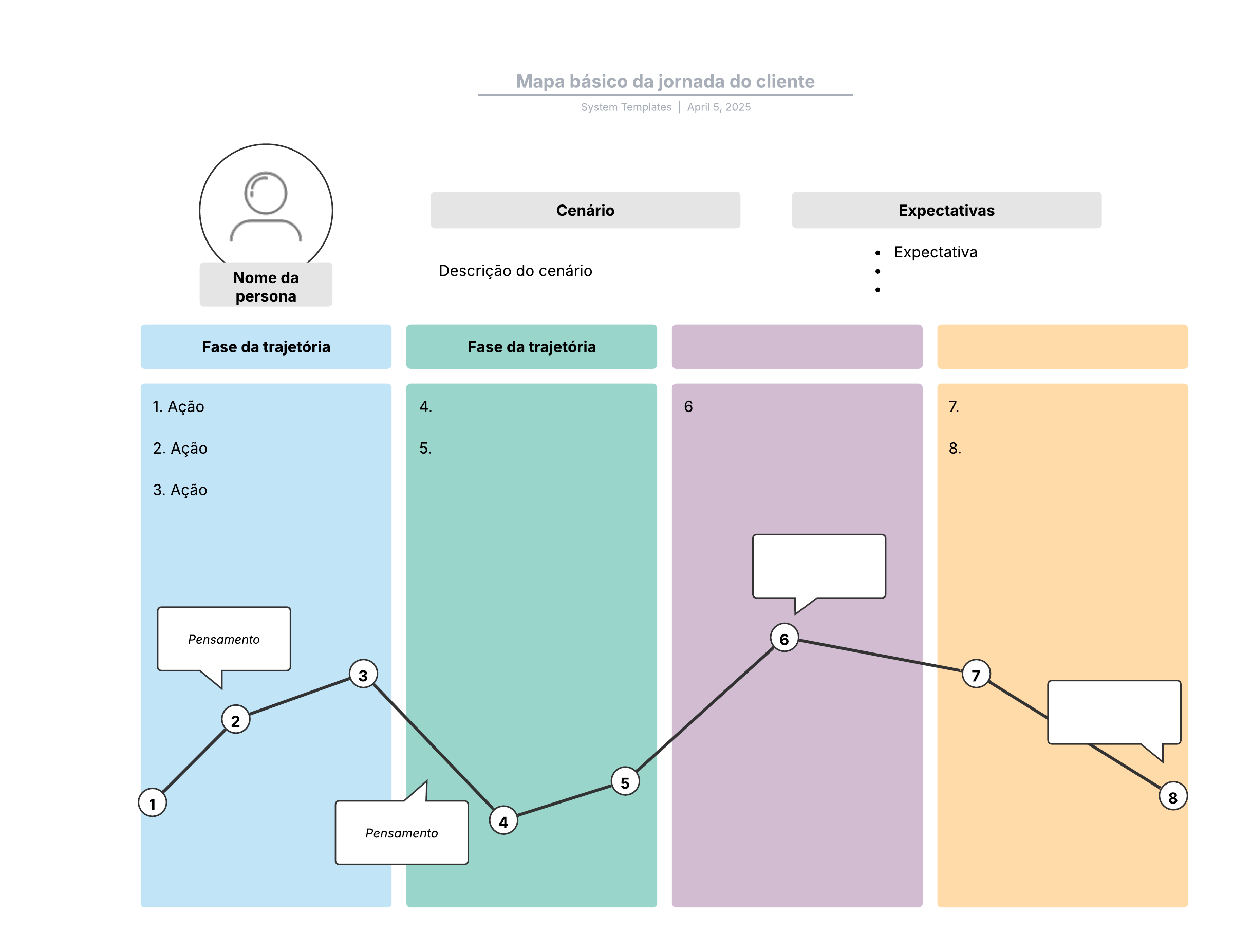 Abra este modelo para ver o exemplo detalhado de um mapa básico de jornada do cliente, personalizável de acordo com seu caso de uso.