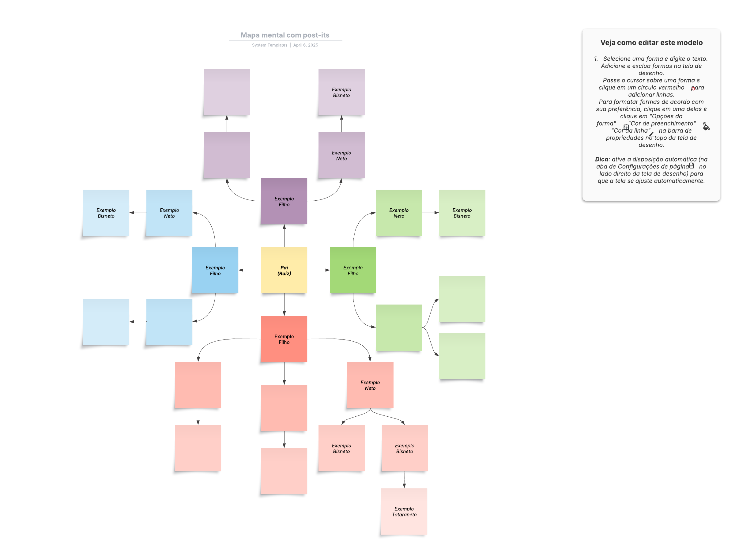 Abra este modelo e adicione conteúdo para personalizar o diagrama de mapa mental de post-its de acordo com seu caso de uso.