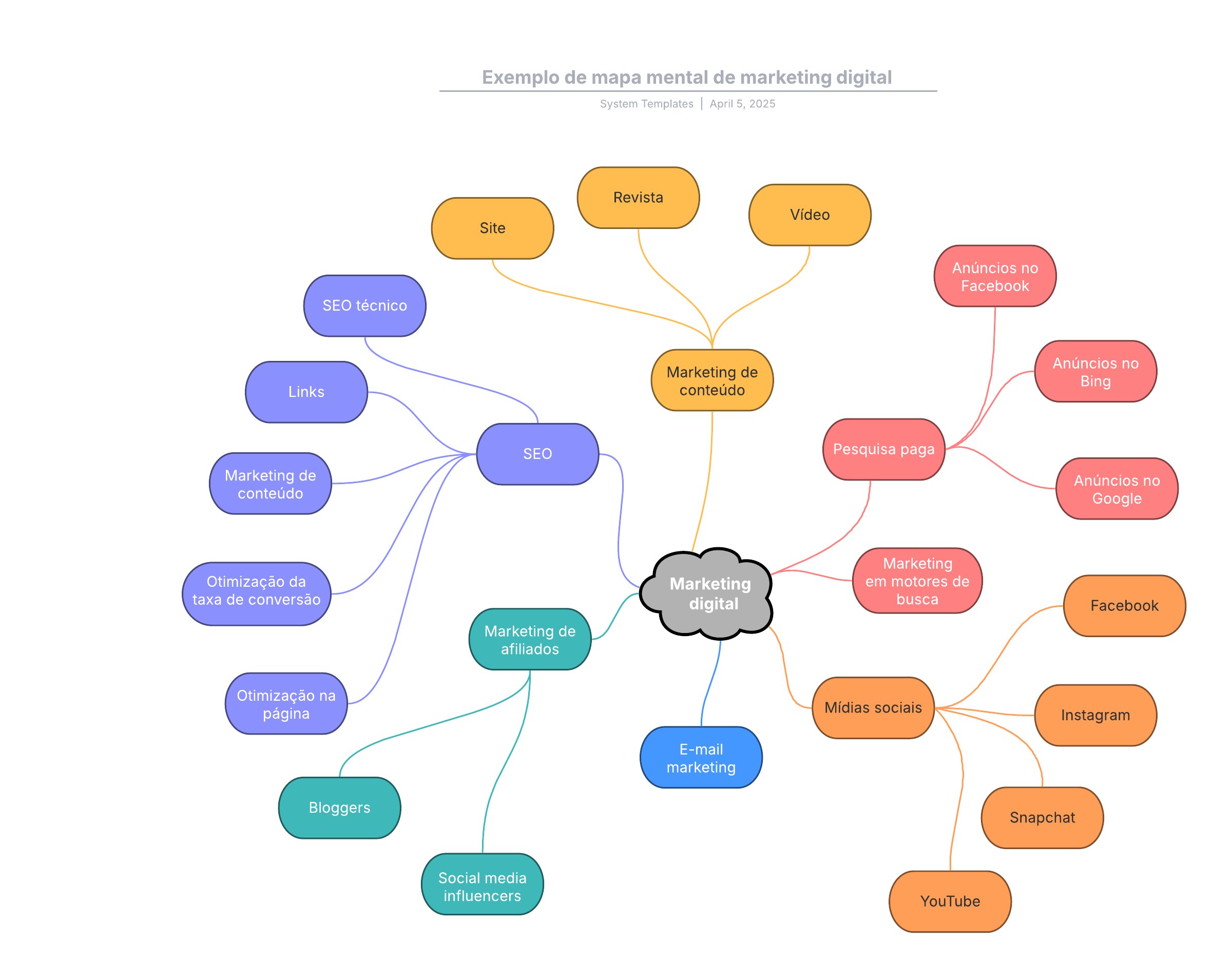 - Acessa a biblioteca de formas de mapas mentais. Abra este modelo para ver o exemplo detalhado de um mapa mental de marketing digital, personalizável de acordo com seu caso de uso.