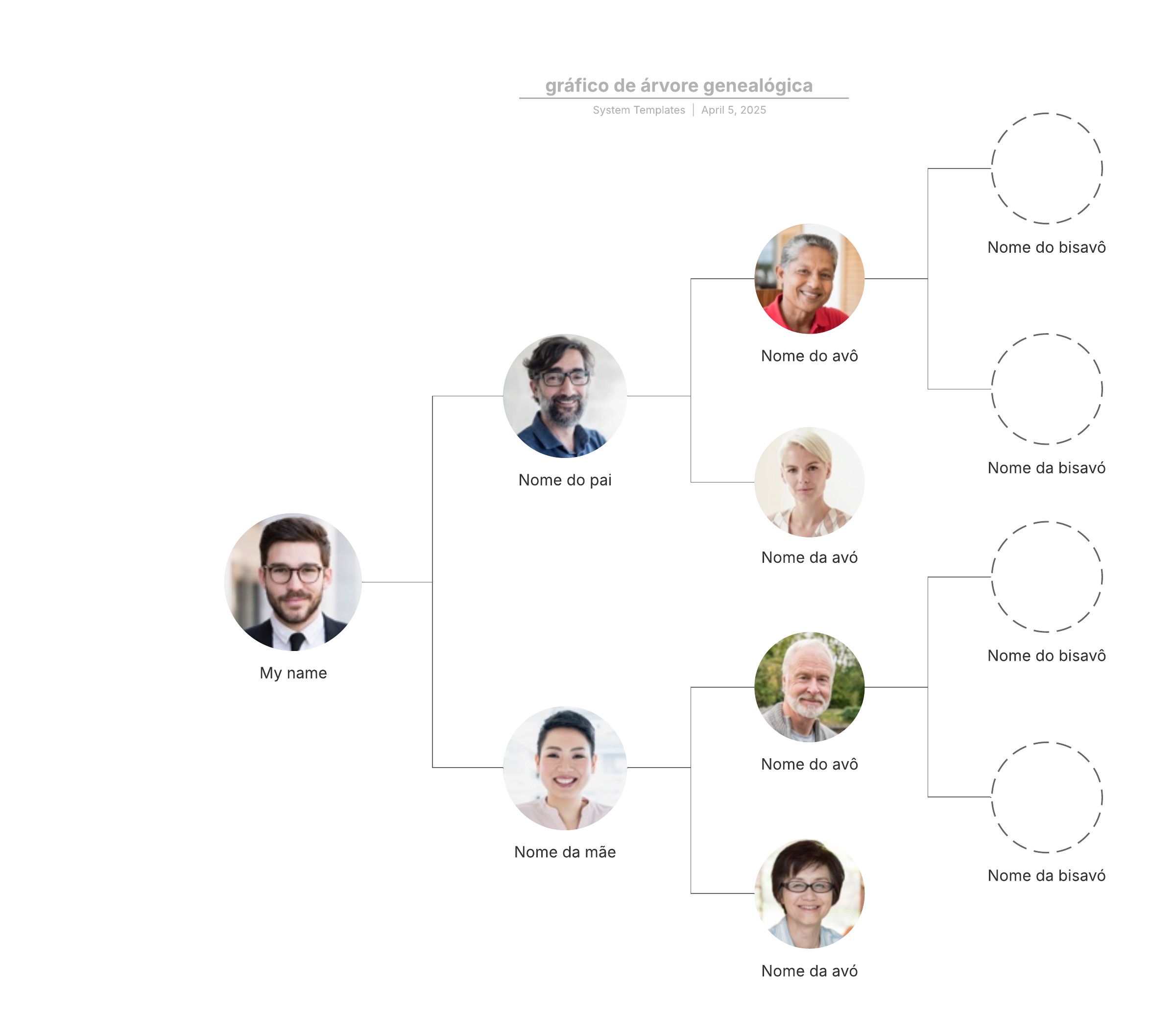 Abra este modelo para ver um exemplo detalhado de um diagrama de árvore genealógica, personalizável de acordo com seu caso de uso.