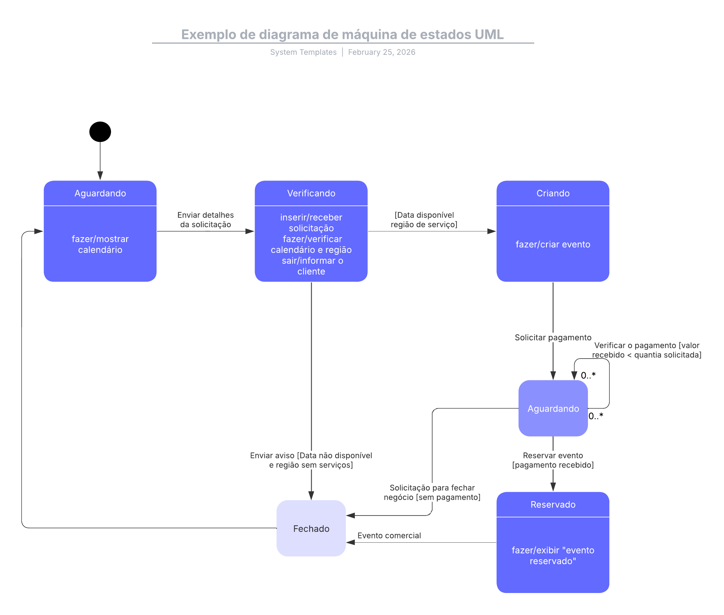 Abra este modelo para exibir um exemplo detalhado de um diagrama de máquina de estados UML, personalizável de acordo com seu caso de uso.