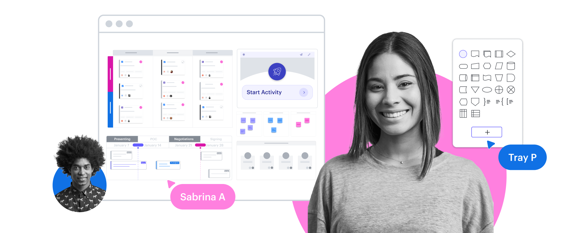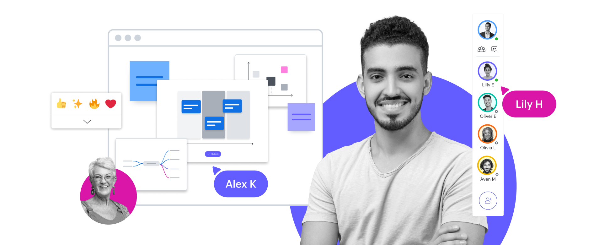 Equipes de gestão de projetos aproveitam os benefícios da colaboração visual para definir fluxos de trabalho, alinhar ações com as partes interessadas e otimizar os processos, independente da localização, do horário ou do método de trabalho das equipes.