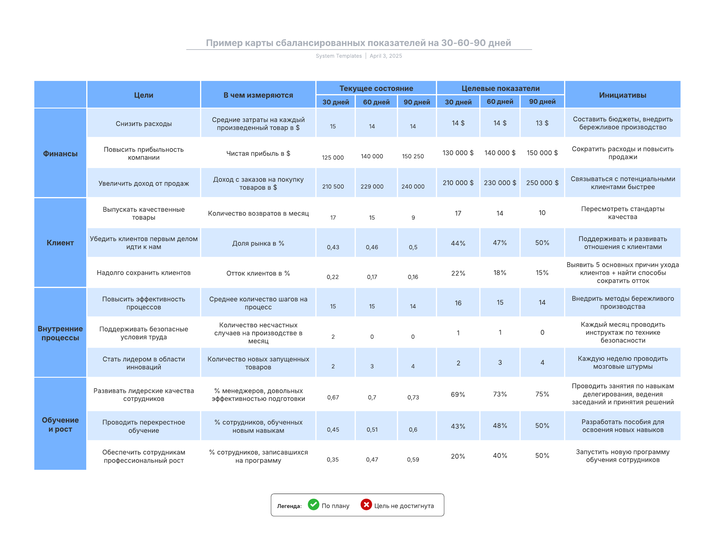 Пример карты сбалансированных показателей на 30-60-90 дней