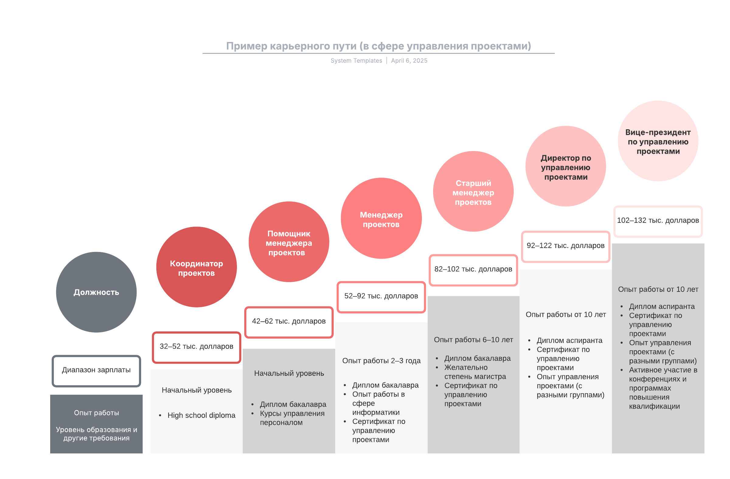 Откройте наш шаблон, чтобы увидеть подробный пример карты карьерного пути, который вы сможете отредактировать и применить в своих целях.