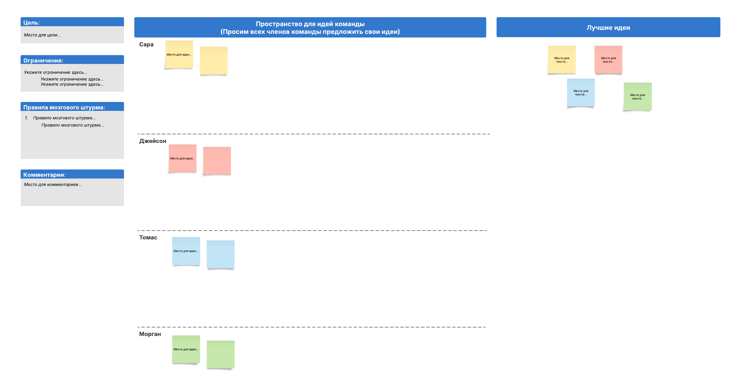 Чтобы подстроить наше пространство для мозгового штурма под свой проект, просто откройте шаблон и внесите необходимую информацию.