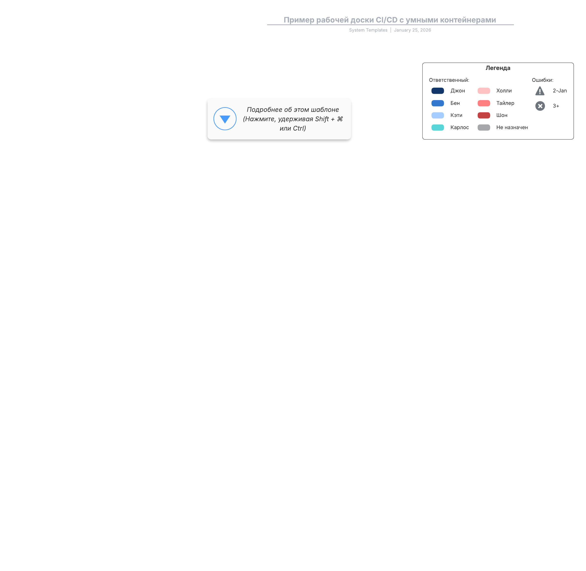 Откройте шаблон, чтобы подробнее рассмотреть наш пример и превратить его в собственную рабочую доску проекта непрерывной интеграции и доставки (CI/CD).