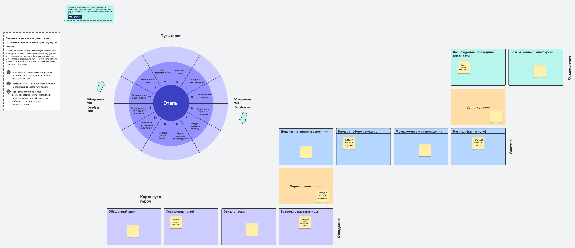 Взгляните на взаимодействие с пользователем сквозь призму пути героя. Теория пути героя приобрела широкую популярность благодаря Джозефу Кэмпбеллу и ничуть не утратила актуальность и по сей день. Ее структура поможет вам наглядно представить путь собственного клиента или пользователя в три основных фазы — ожидание, участие и осмысление.