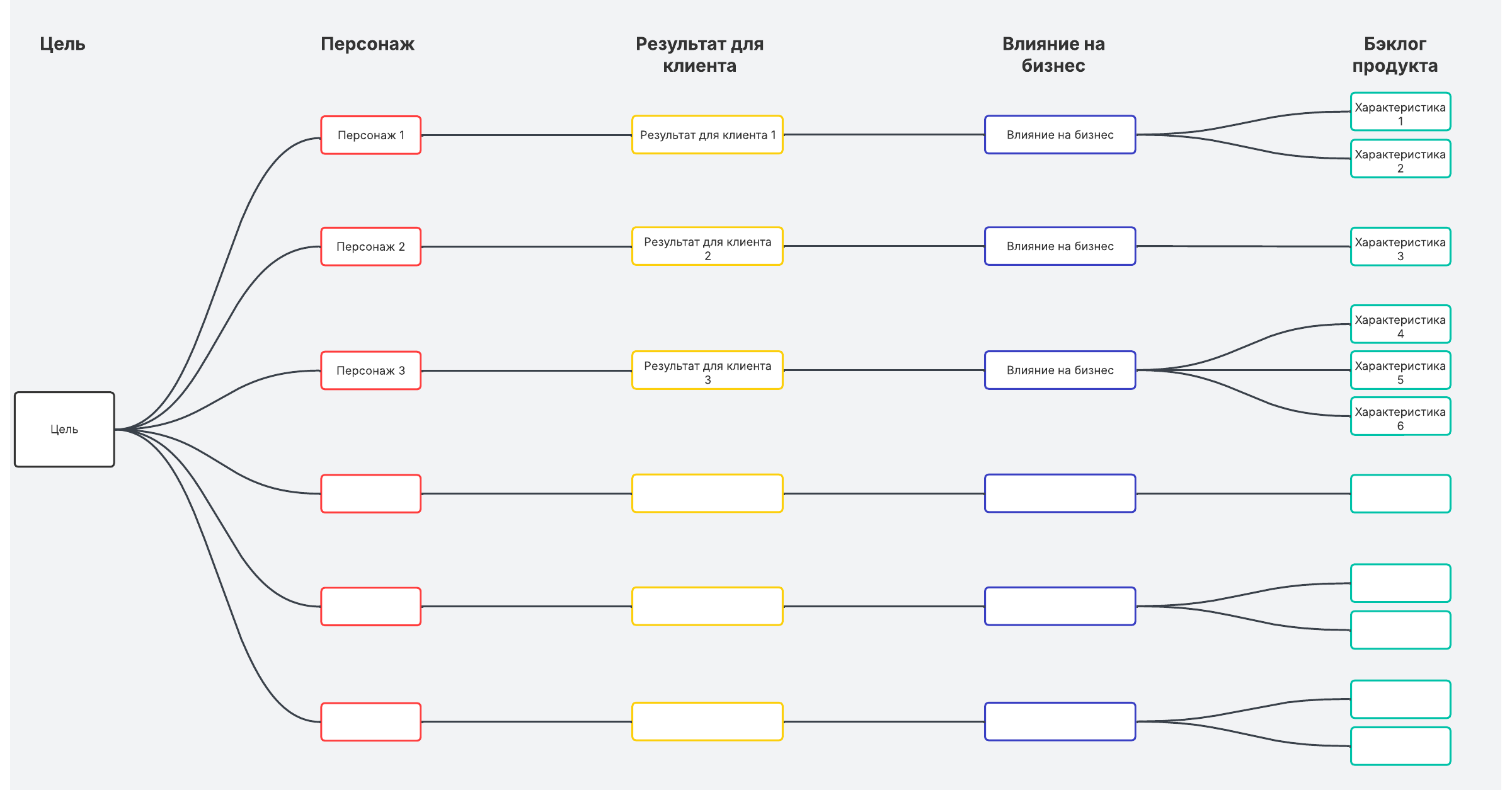 Этот шаблон картирования результата позволяет собирать информацию, разрабатывать возможные результаты для персонажа клиента и учитывать влияние на ваш бизнес.