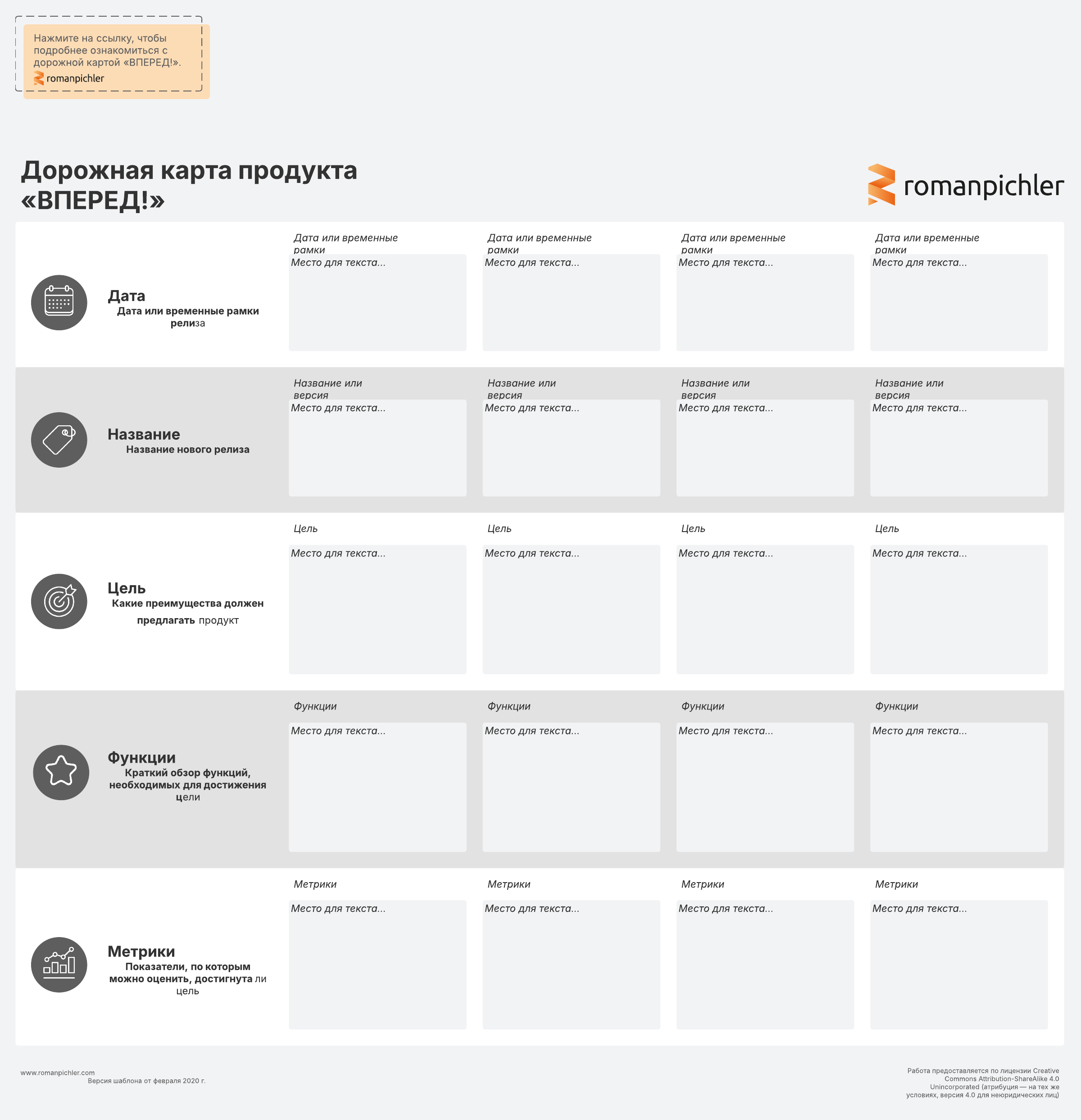 Используйте дорожную карту продукта GO, первоначально созданную экспертом по управлению продуктами Романом Пихлером (Roman Pichler), для описания целей, которых должен достичь ваш продукт, и для согласования действий заинтересованных сторон. Эта дорожная карта ориентирована на достижение целей, поэтому разговор переходит от обсуждения особенностей к согласованию желаемых результатов и преимуществ.
