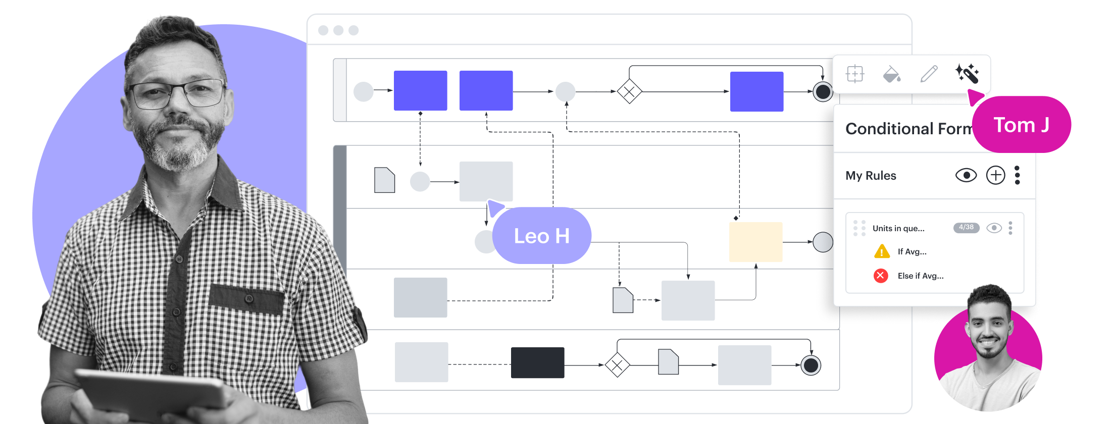Create and align on complex operational processes with the Lucid Visual Collaboration Suite. Enable data-driven decision-making to optimize efficiency.