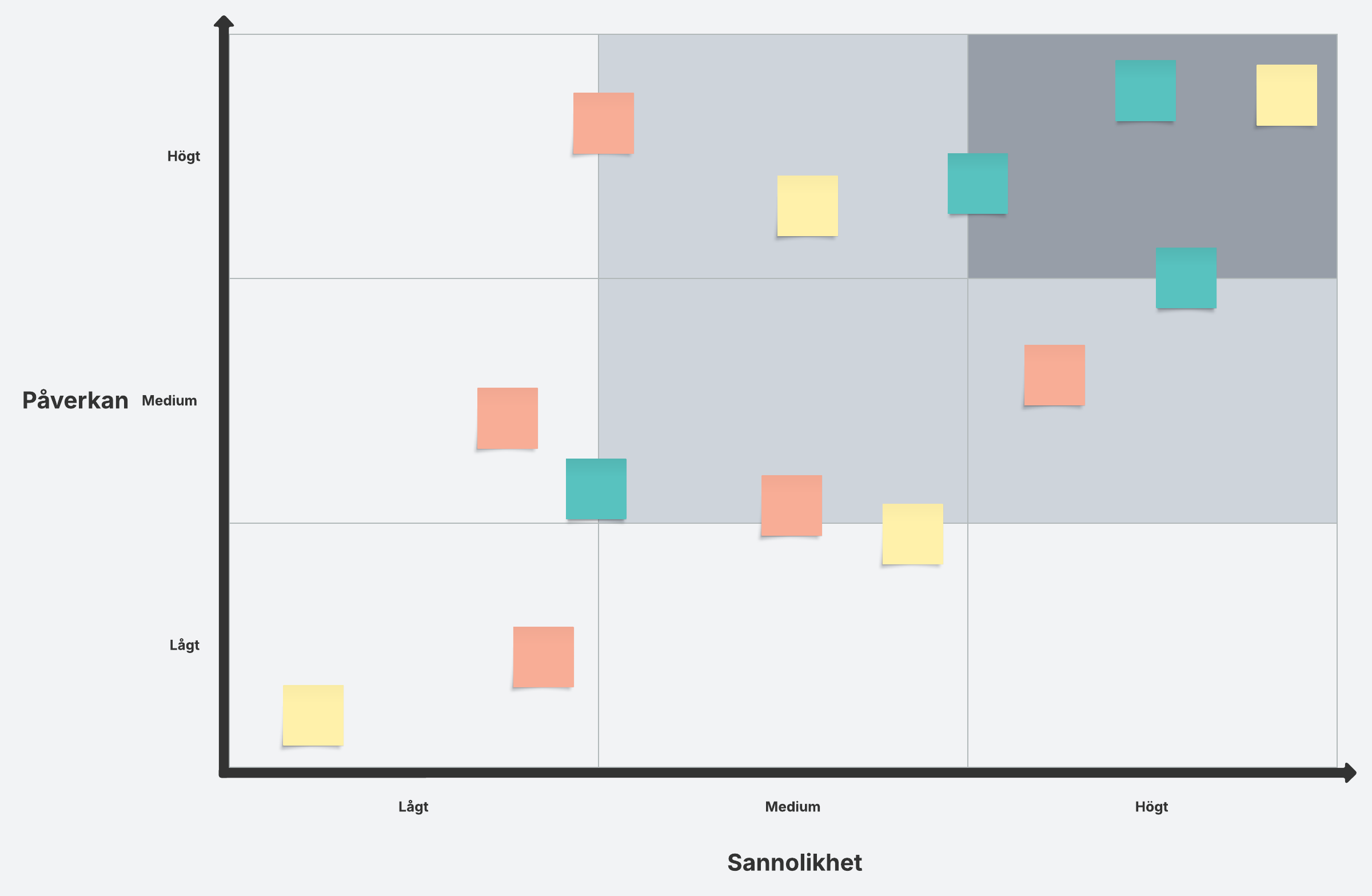 Prioritera åtgärder eller idéer efter effekt och sannolikhet. Varje axel är uppdelad i låg, medium och hög för att ge mer struktur än en traditionell fyrfältare.