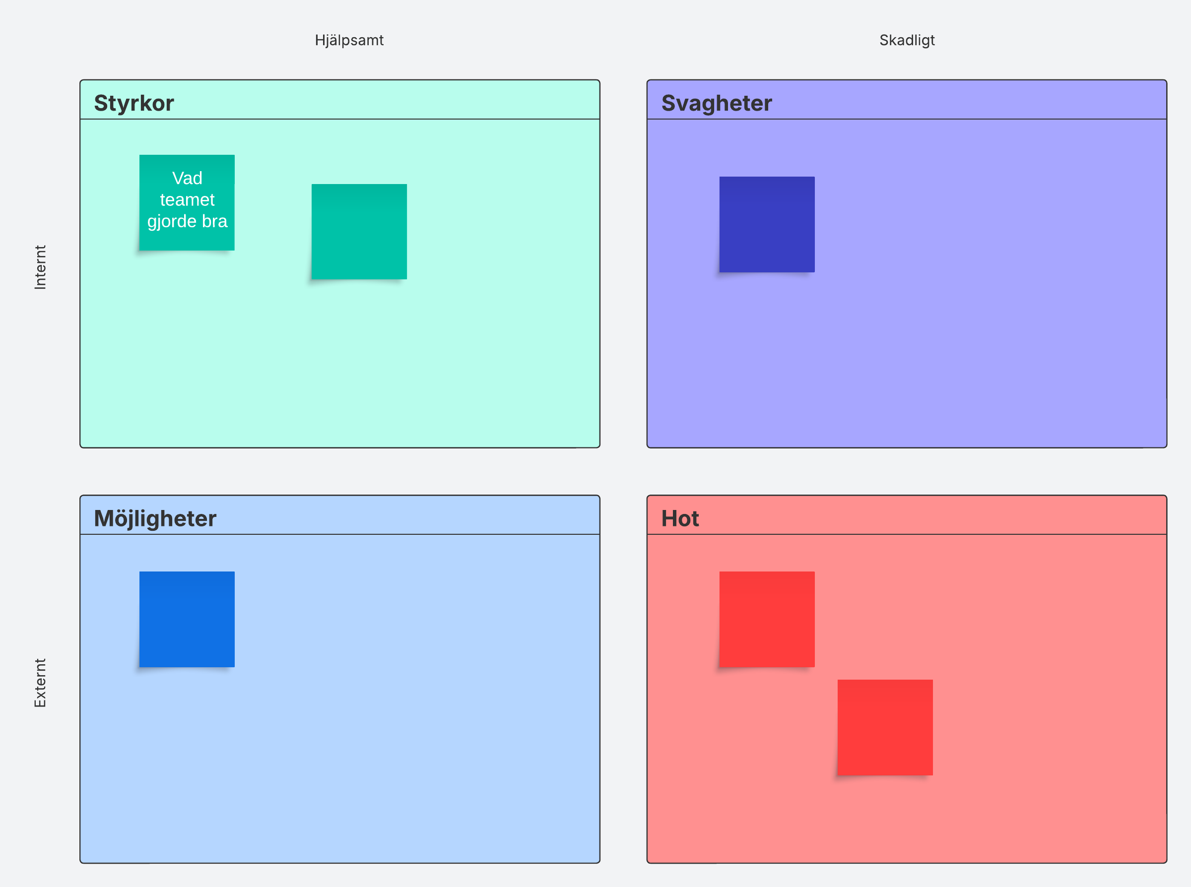 Gör en djupdykning i ditt företags nuläge eller i specifika processer och projekt. En SWOT-analys hjälper team att undersöka styrkorna (Strengths), svagheterna (Weaknesses), möjligheterna (Opportunities) och hoten (Threats) i en given situation.