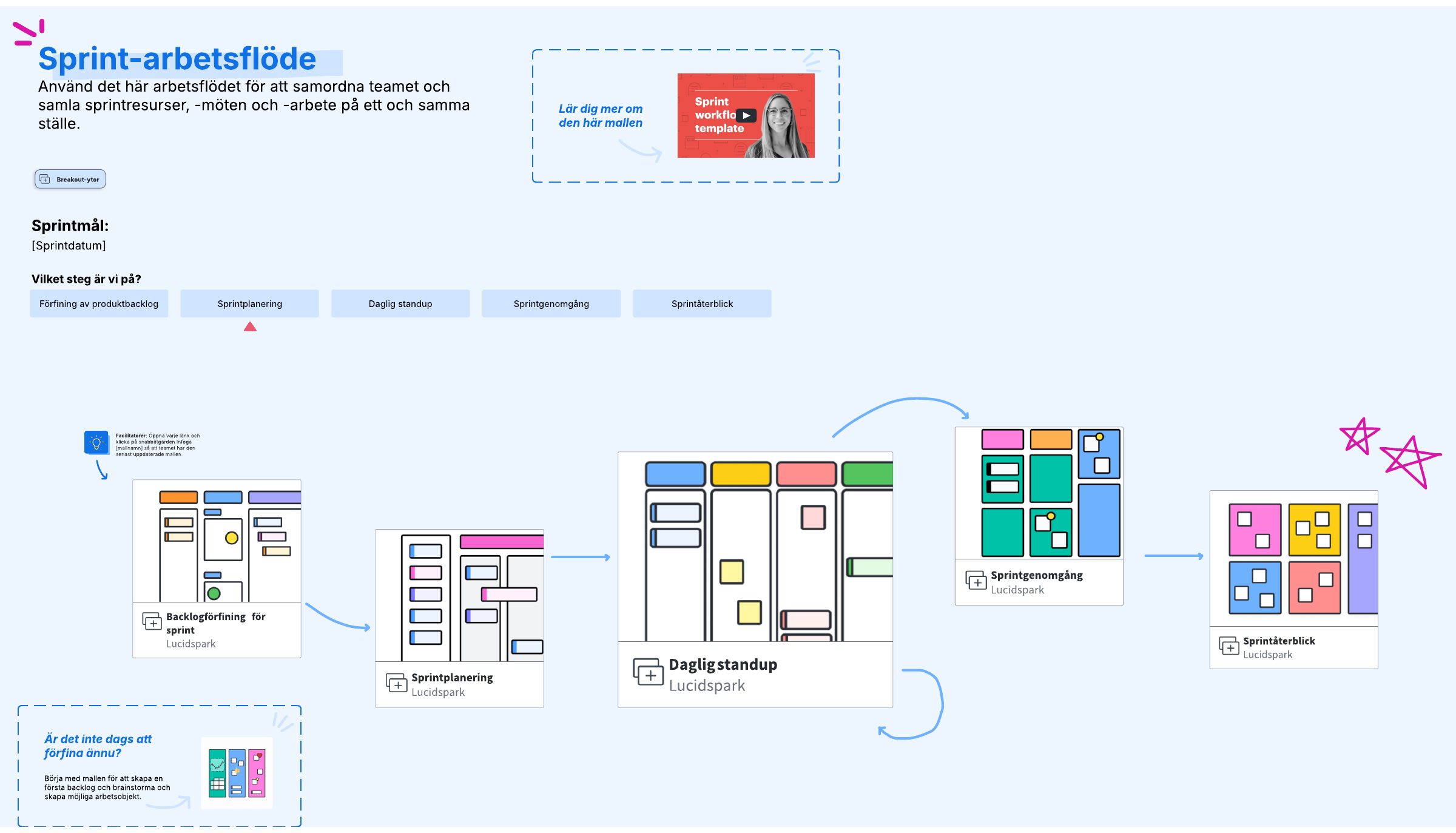 Använd den här mallen för att effektivisera sprintens agila händelser och samla dem på en och samma plats. Mallen är konfigurerad för att användas vid förfining av produktbacklog, sprintuppskattning, sprintplanering, dagliga standups, sprintgenomgång och retrospektiv – allt på samma arbetsyta.