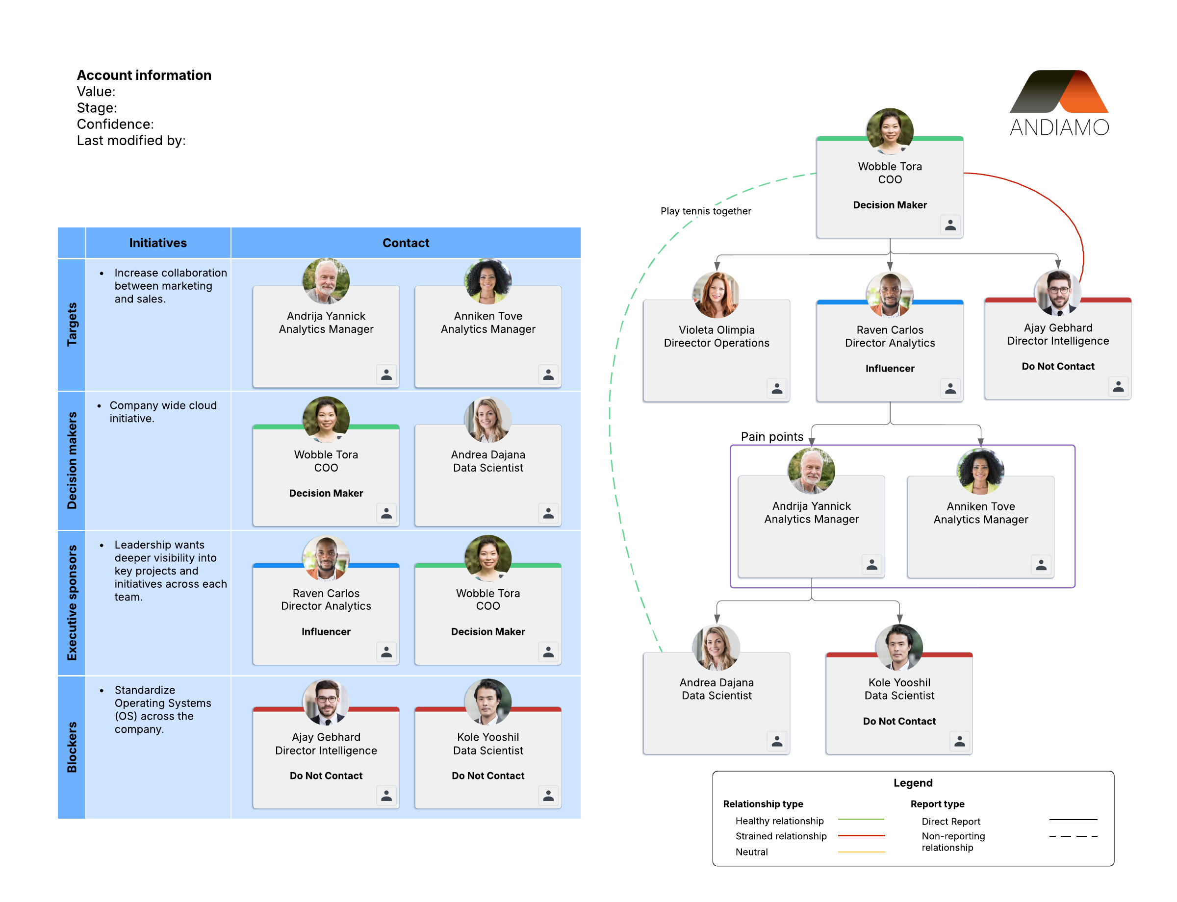 - Use an org chart of your account contacts to show reporting relationships.