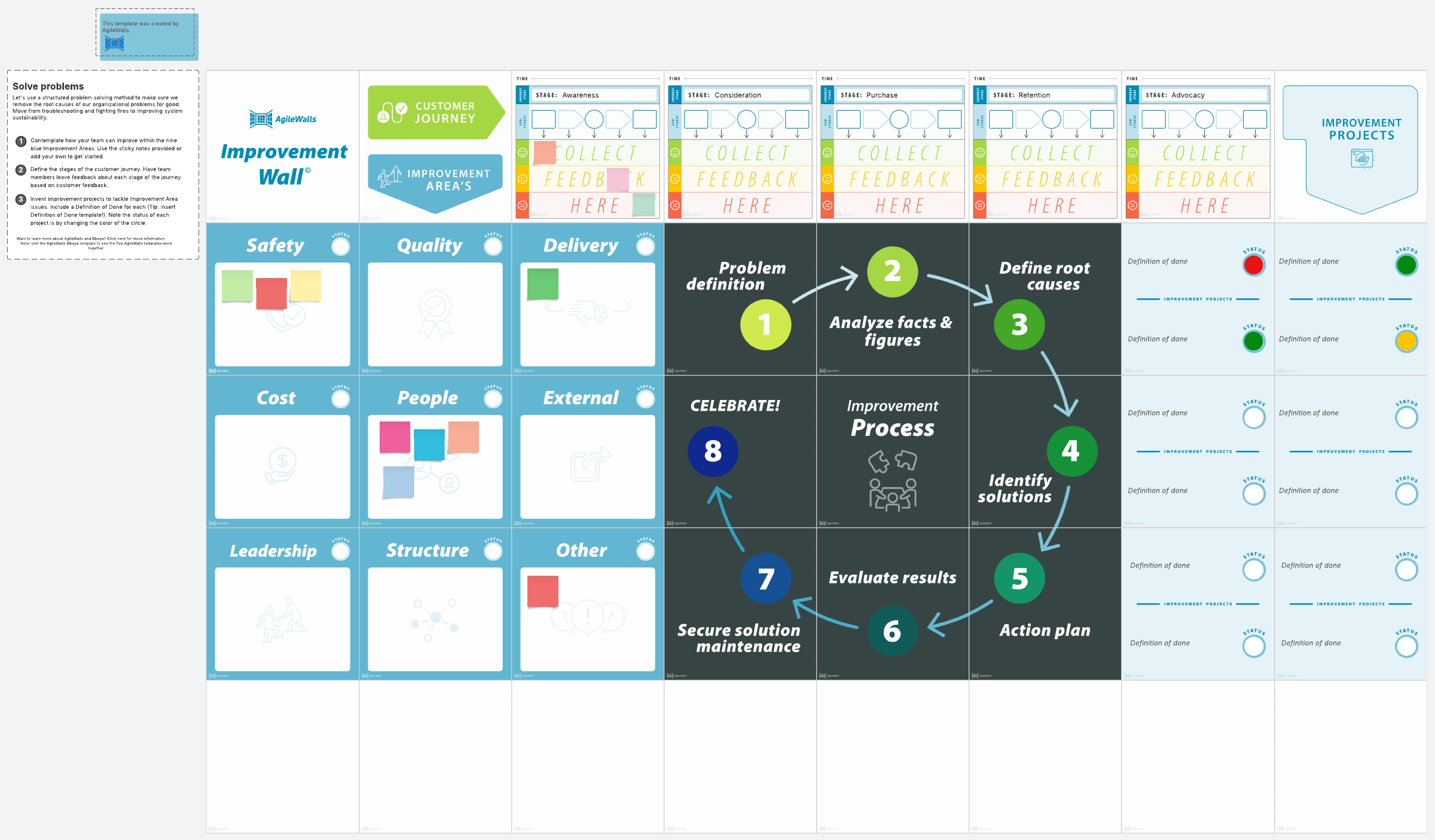 - Brainstorm improvement projects to tackle any issues you’ve identified in the Improvement Areas. Include a Definition of Done for each project and change the color of the status circle with traffic light colors to signal how much attention a project needs.