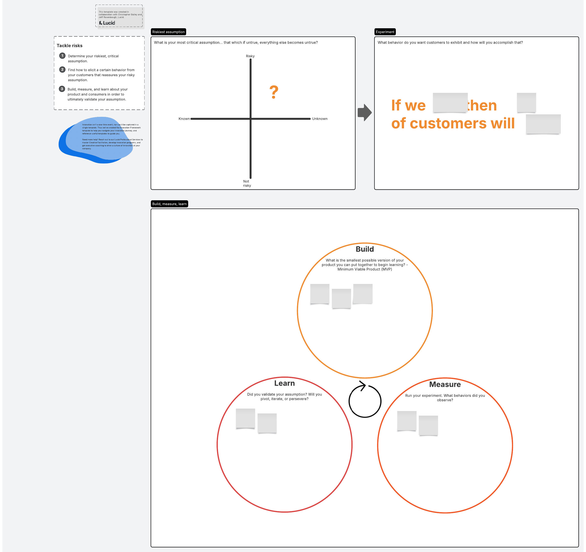 - First, state your most most critical assumption as determined by the critical assumptions template, and plot this in the “Riskiest assumption” container.