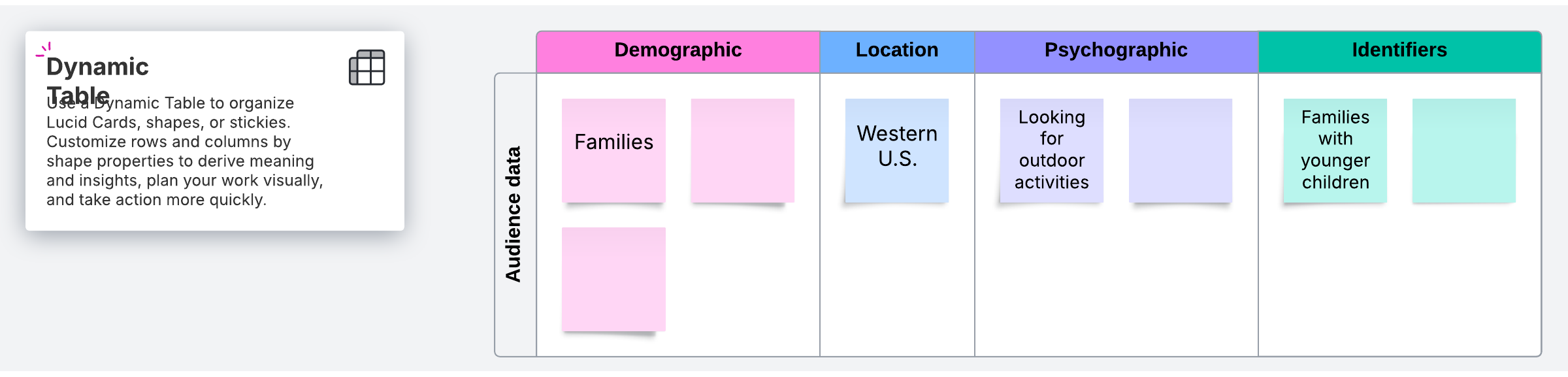 The Lucidspark audience analysis template includes sections for several different areas of information: demographic, location, psychographic, and identifiers. The more specific and granular your information, the better you’ll be able to target individuals that are more likely to buy your product.