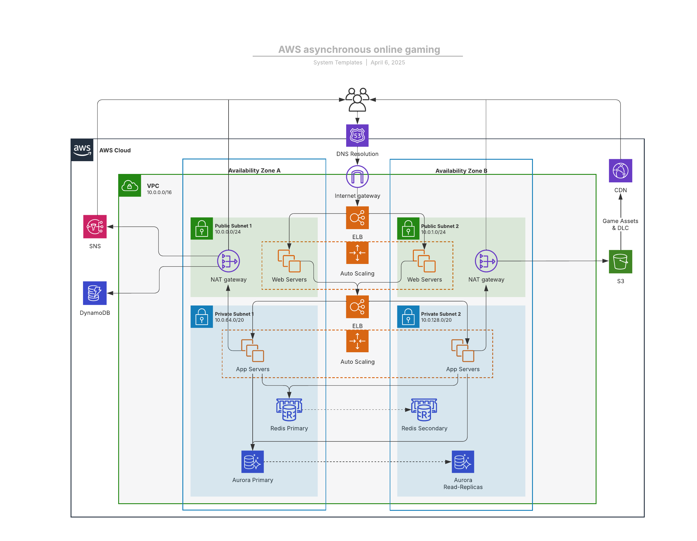 Open this template to view a common mobile and online game architecture that reflects the best practices of some of the largest games running on AWS today.