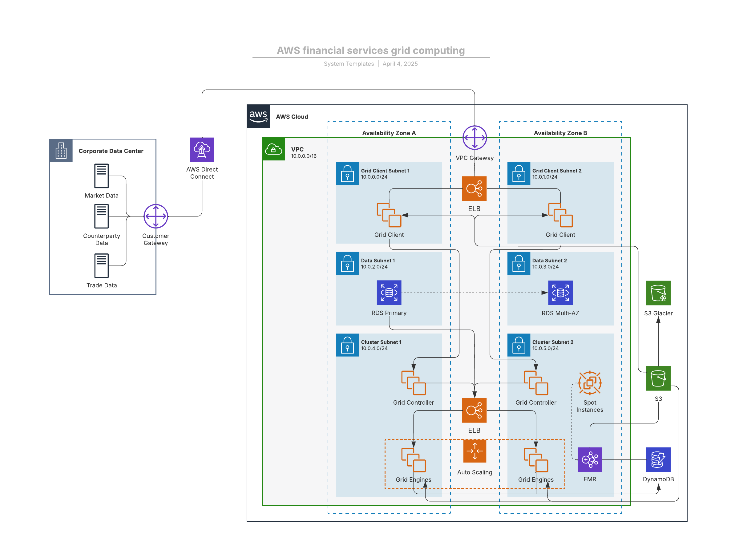 Open this template to view a detailed example of an AWS financial services grid computing system that you can customize to your use case.
