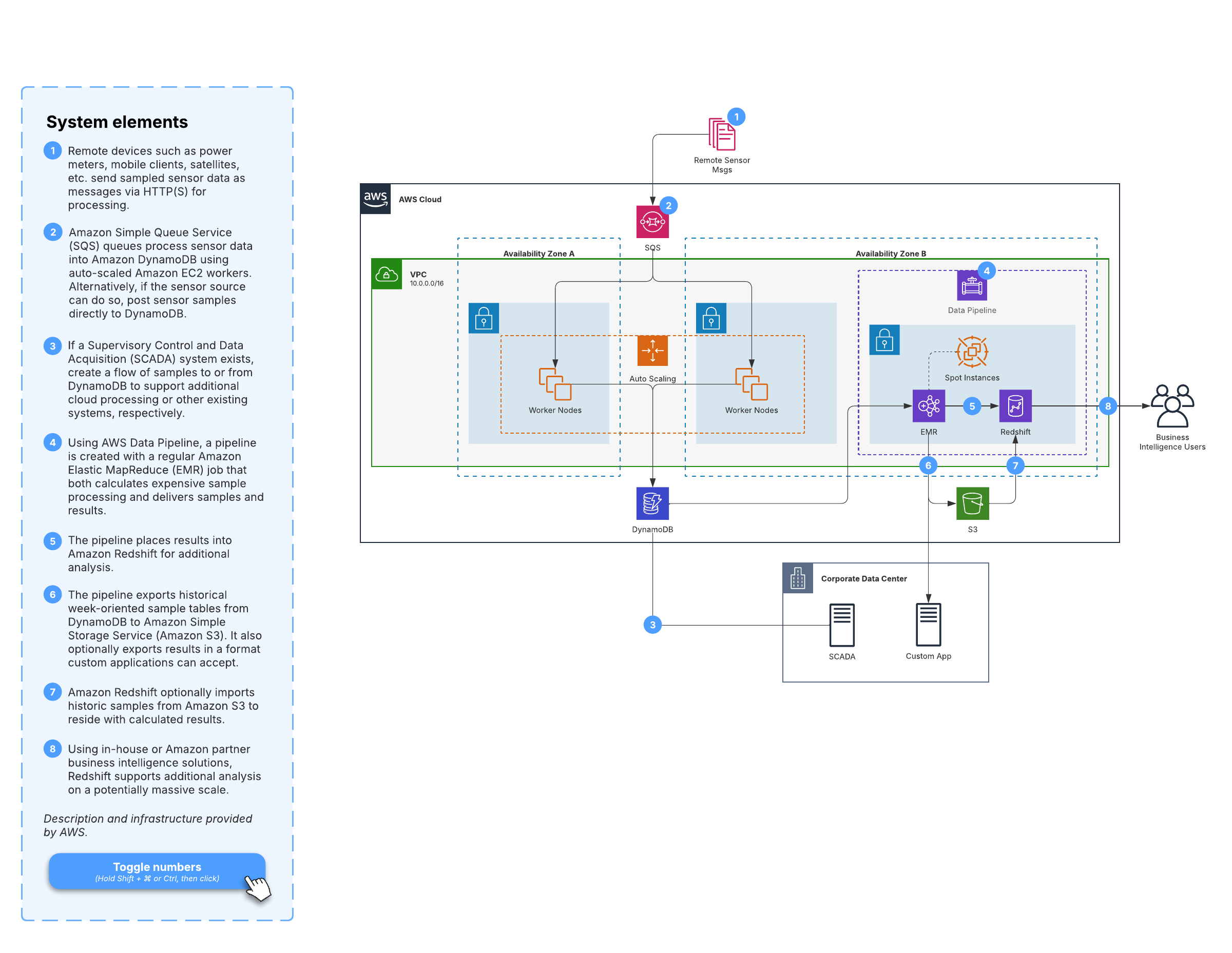 Open this template to view a detailed example of an AWS system designed to process time series data (data that arrives as a succession of regular measurements, such as a power meter or satellite).