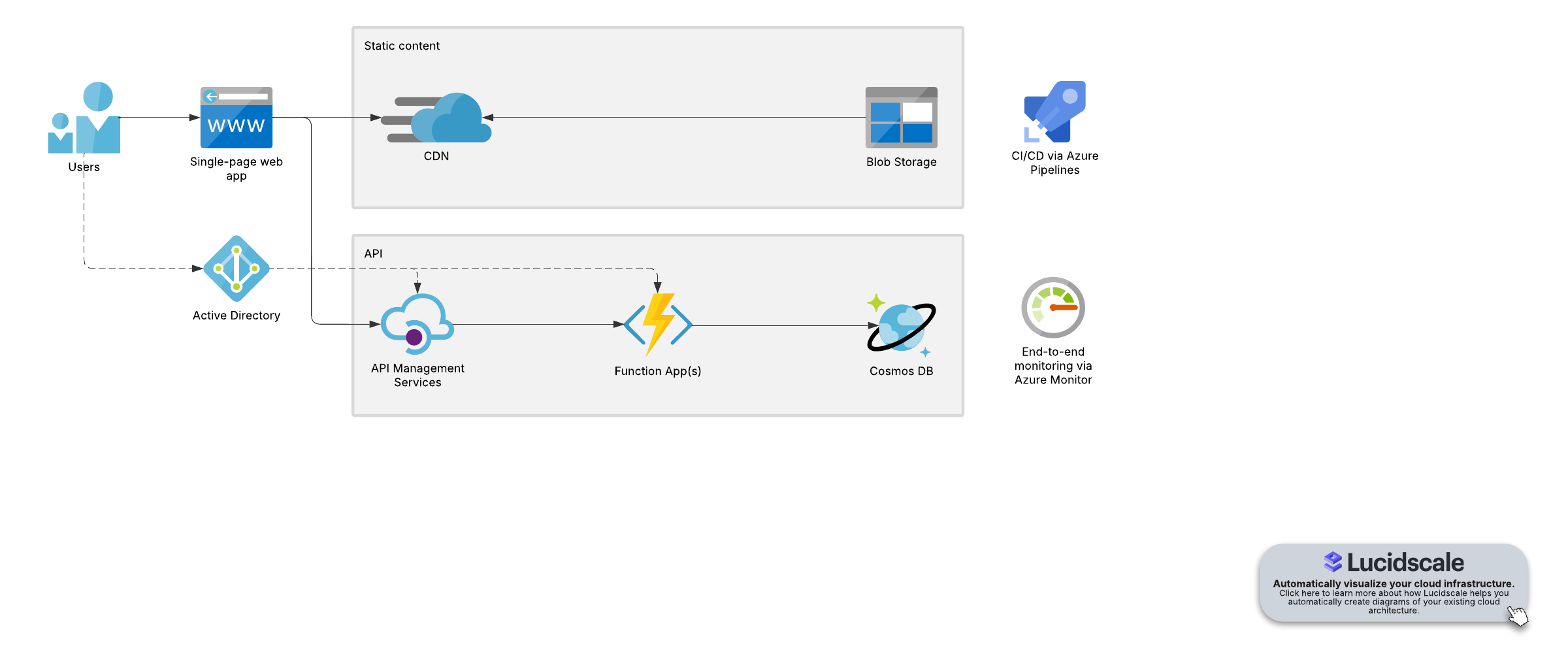 Open this template to view an Azure serverless web app hosting reference architecture that you can customize to your use case.